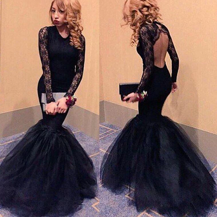 Sexy Black Lace Long Sleeve Prom Dresses Mermaid Open Back Evening Party Gowns