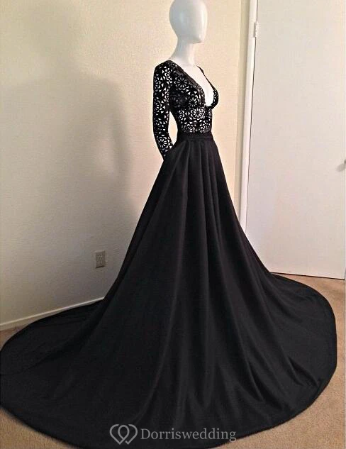 Sexy Black Long Sleeves Lace Porm Dress With V-Neck A-Line Evening Dress