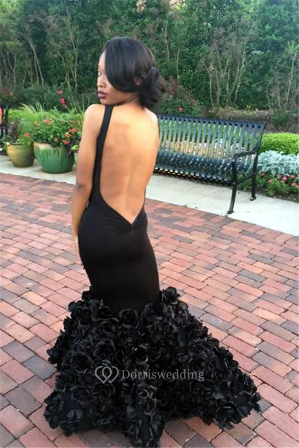 Sexy Black Sleeveless Mermaid Prom Dress Floor Length Flowers Party Gowns
