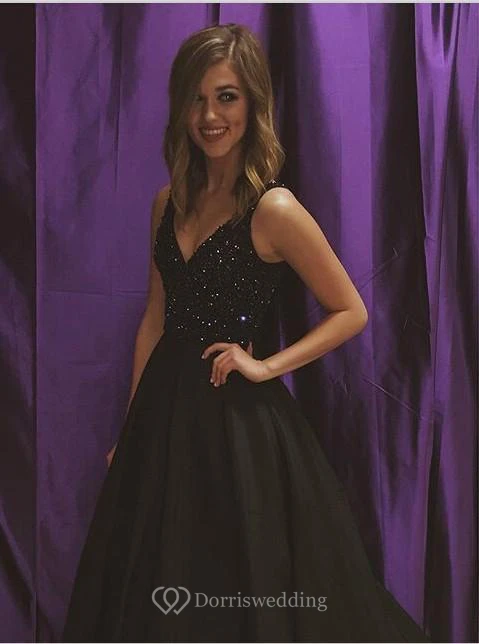 Sexy Black V-Neck Sleeveless Prom Dresses Beadings Sequins A-Line