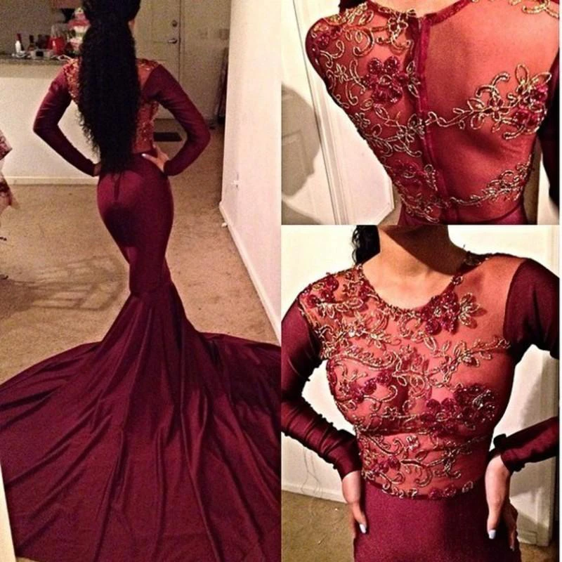 Sexy Burgundy Long Sleeve Prom Dresses Appliques Mermaid With Train