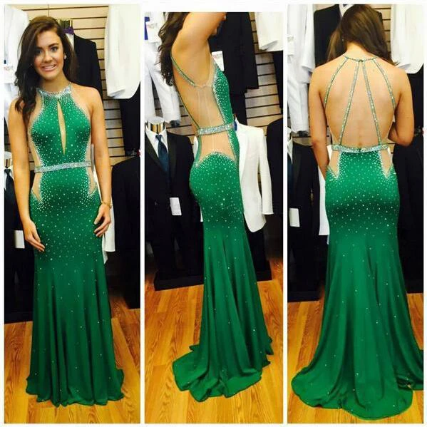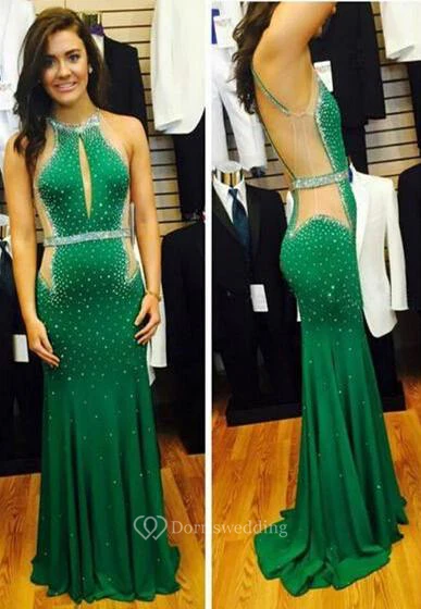 Sexy Halter Mermaid Beadings Green Prom Dress Sweep Train