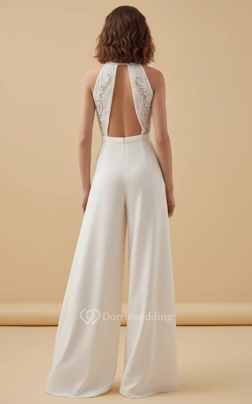 This jumpsuit is the ultimate "sexy bride" look. The halter neck and keyhole cutout are so flattering on the bust, and the split legs are a fantastic feature. The fabric is high quality and has a nice weight to it. I felt so powerful and beautiful in this. It’s a great choice for a modern, confident bride who isn't afraid to show some leg!