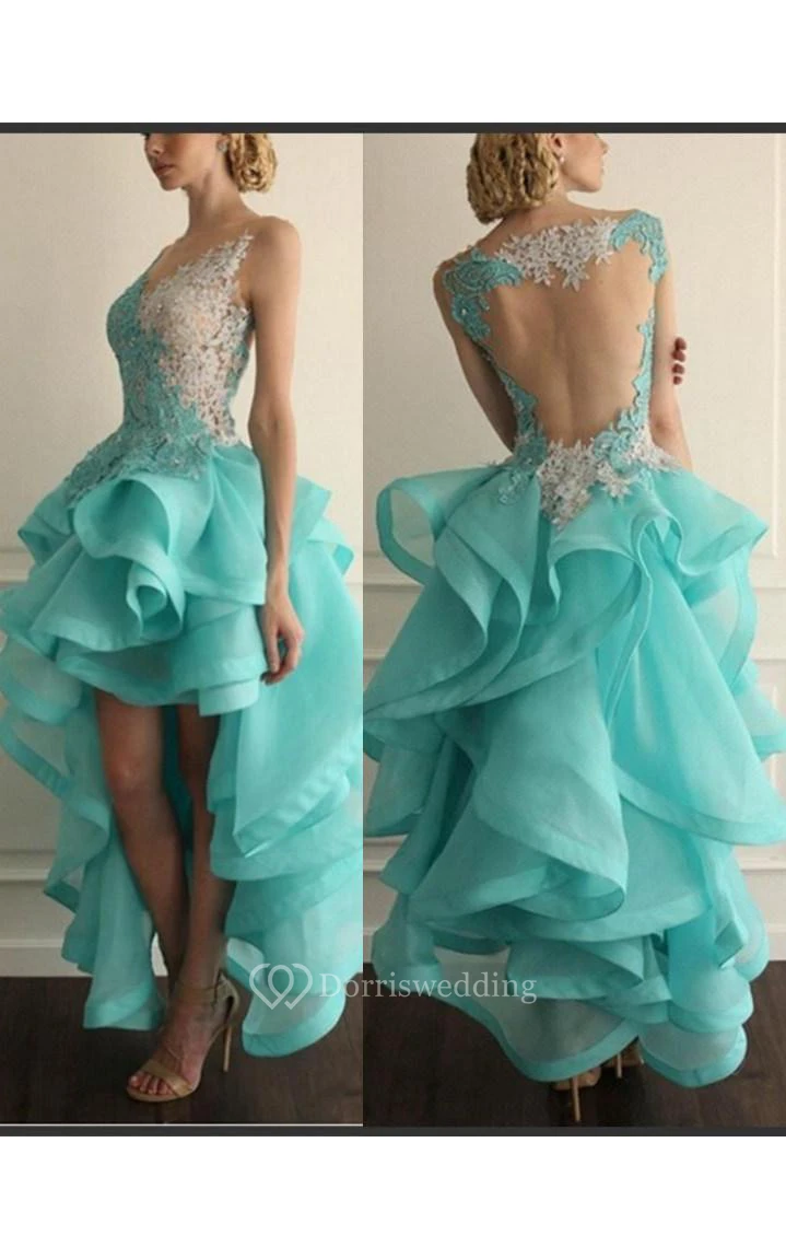 Sexy Hi-Lo Sleeveless Prom Dress With Appliques Ruffles