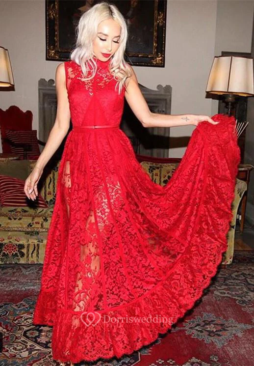 Sexy High Neck Sleeveless Red Evening Dress Lace