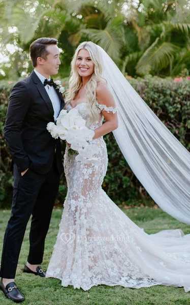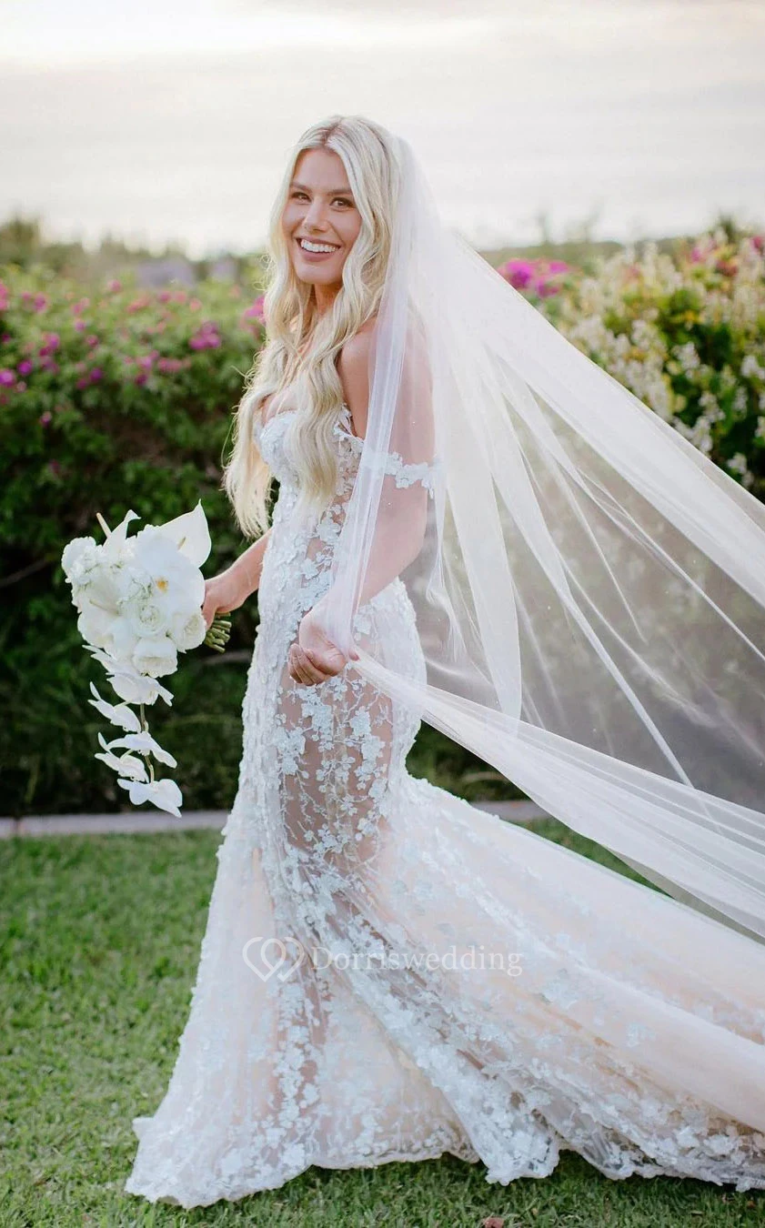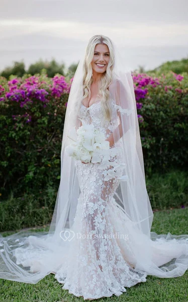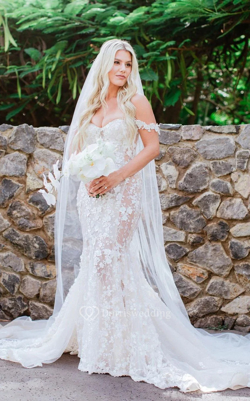 Sexy Illusion Off-the-shoulder Lace Applique Mermaid Tulle Beach Wedding Dress