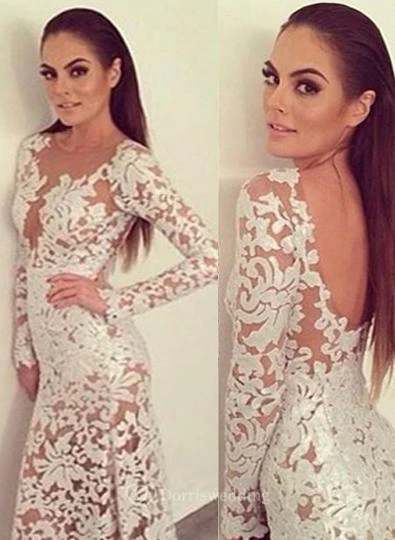 Sexy Lace Long Prom Dress Sleeve Sheath See Through Evening Party Gowns