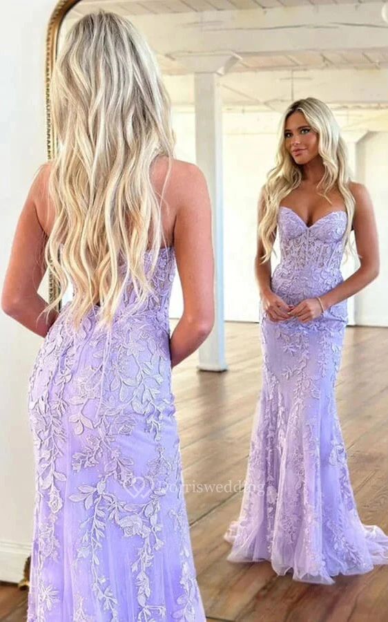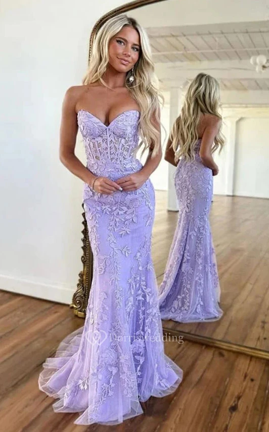 Sexy Lilac Mermaid Sheath Lace Applique Corset Back Evening Prom Dress