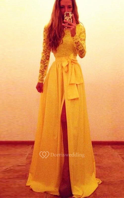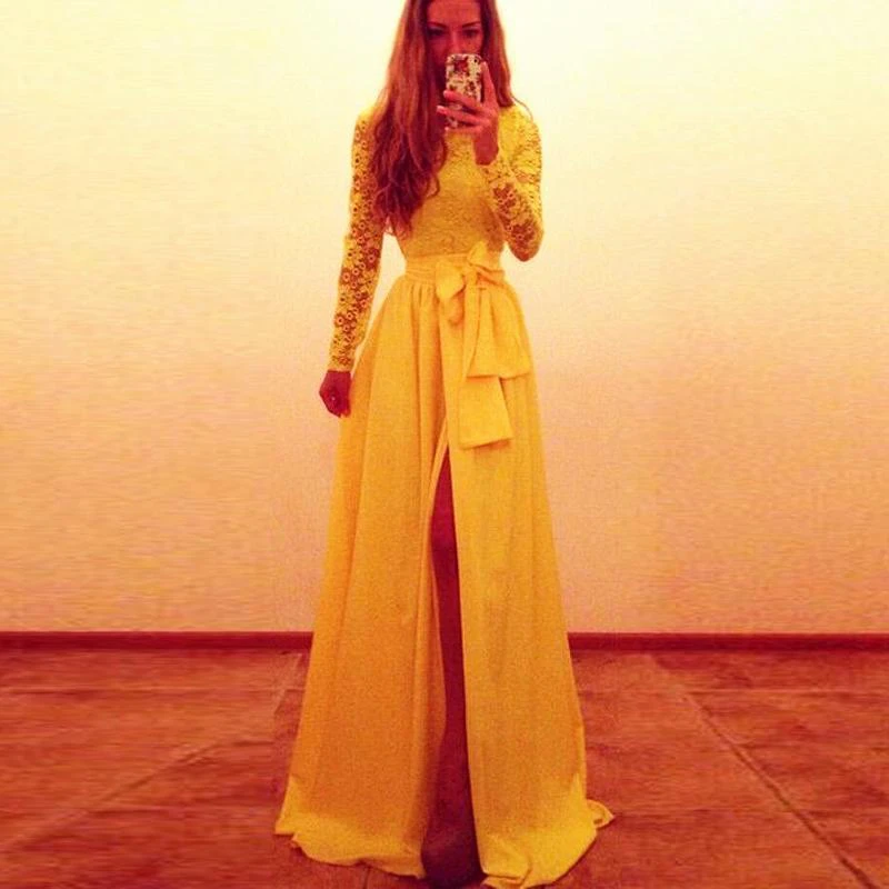 Sexy Long Sleeve Lace Chiffon Yellow Evening Dress Bowknot Front Split