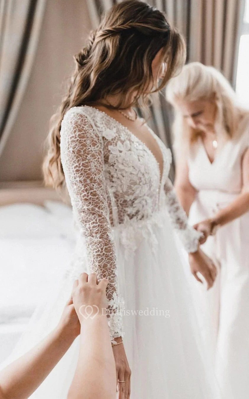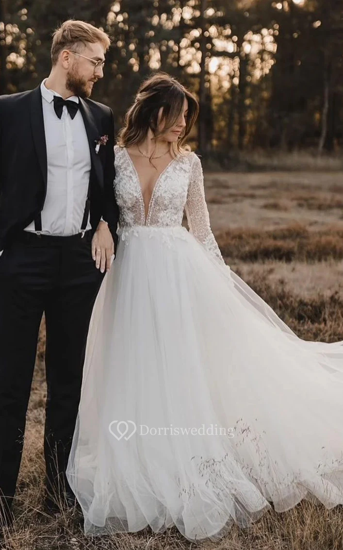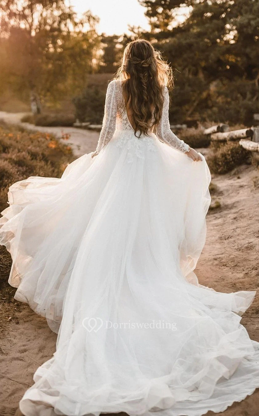 Sexy Long Sleeve Plunged Empire Lace Tulle A-line Boho Wedding Dress