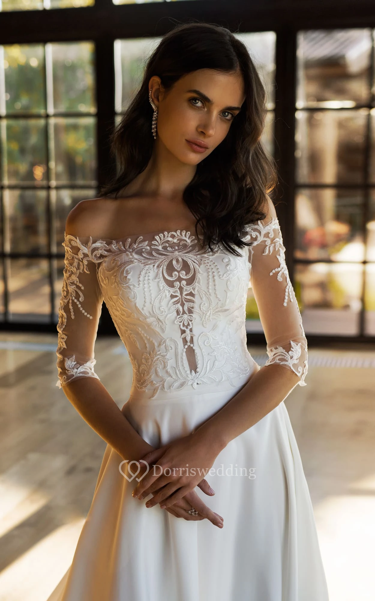 Sexy Off-the-shoulder A Line Satin and Lace Sweep Train Modest Wedding Dress