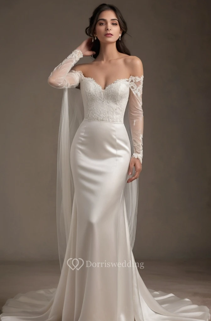 Sexy Off-the-shoulder Illusion Long Sleeve Sheath Satin Wedding Dress