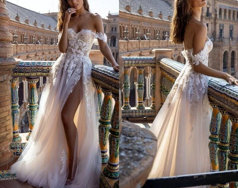 Sexy Off-the-shoulder Lace Elegant Front Split Tulle Wedding Dress