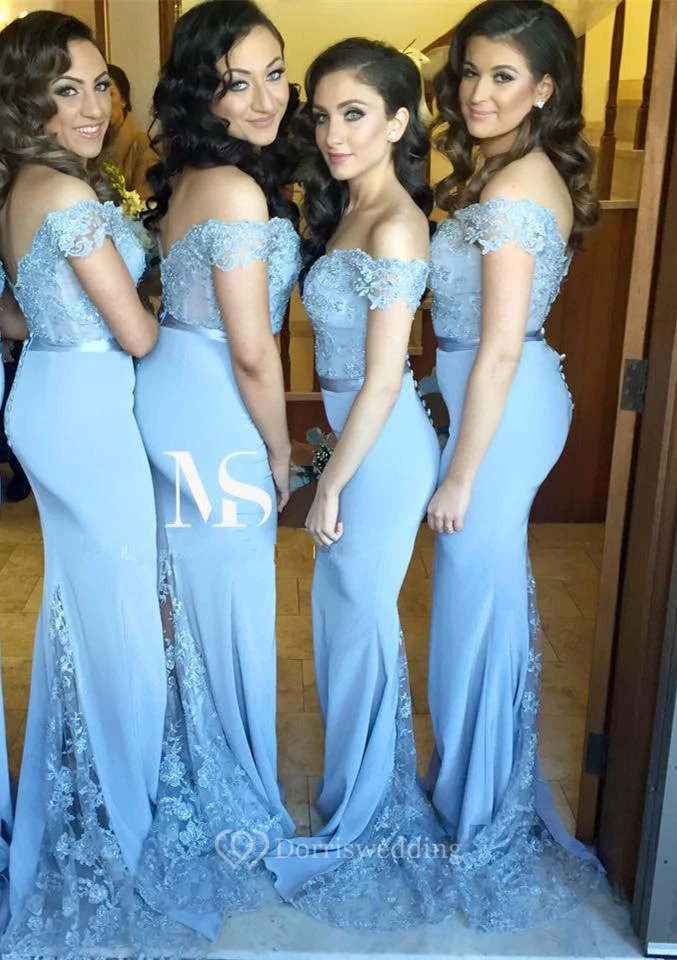 Sexy Off-the-shoulder Mermaid Lace Appliques Blue Bridesmaid Dress Zipper Button Back