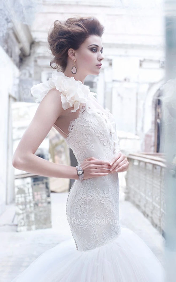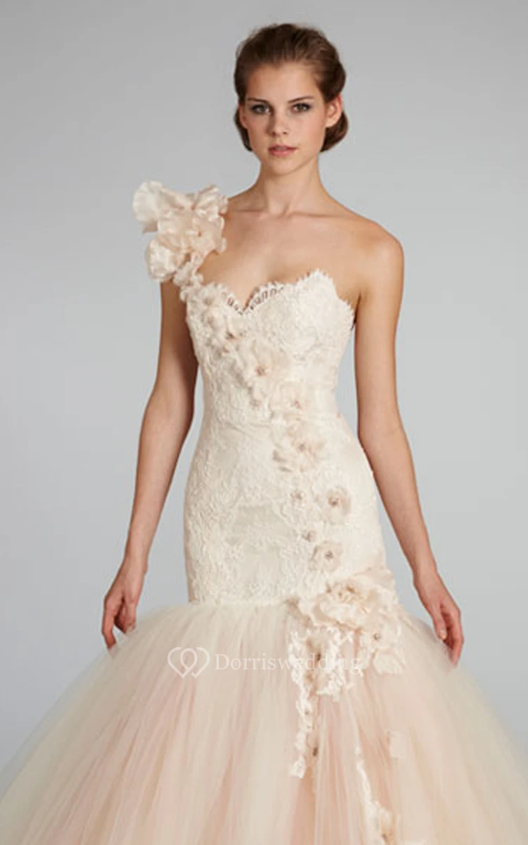 Sexy One Shoulder Lace Bodice Tulle Ball Gown With Cascading Floral Detail