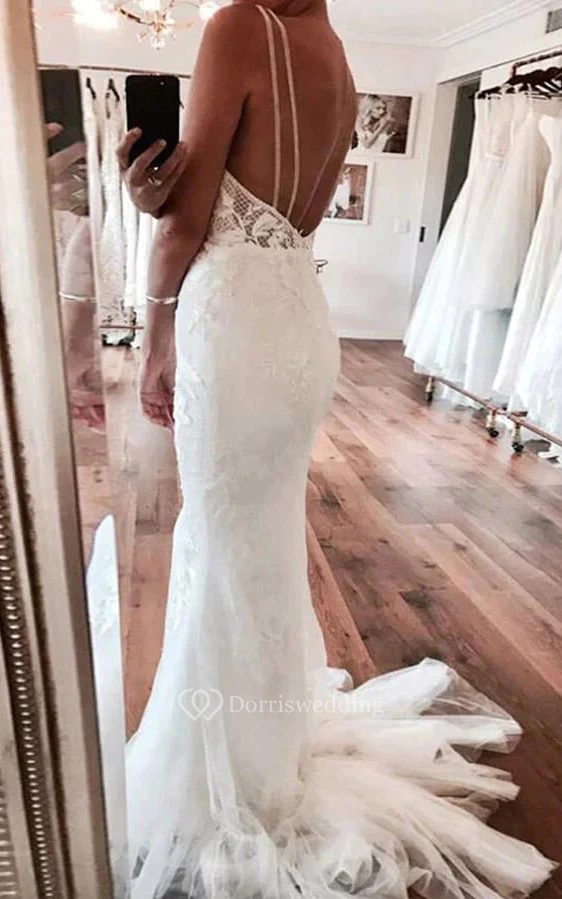 Sexy Plunged Sheath Applique Spaghetti Beach Wedding Dress