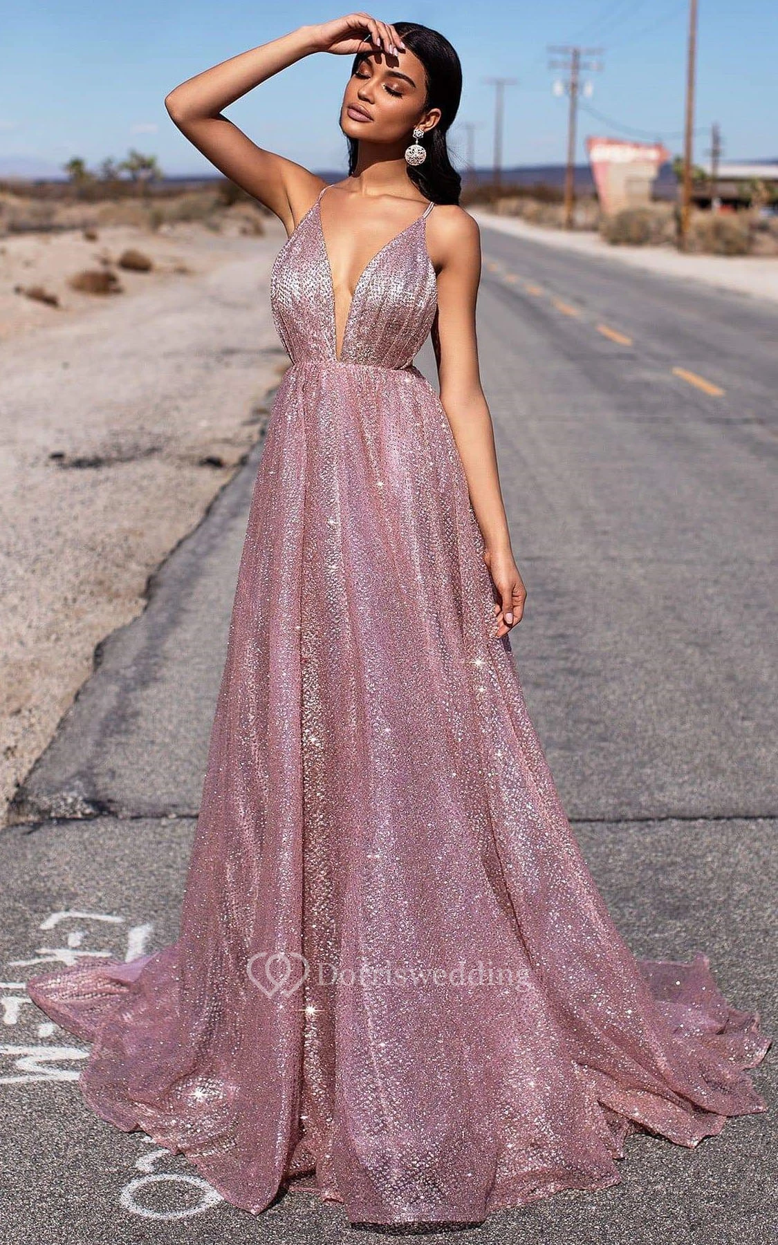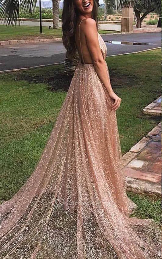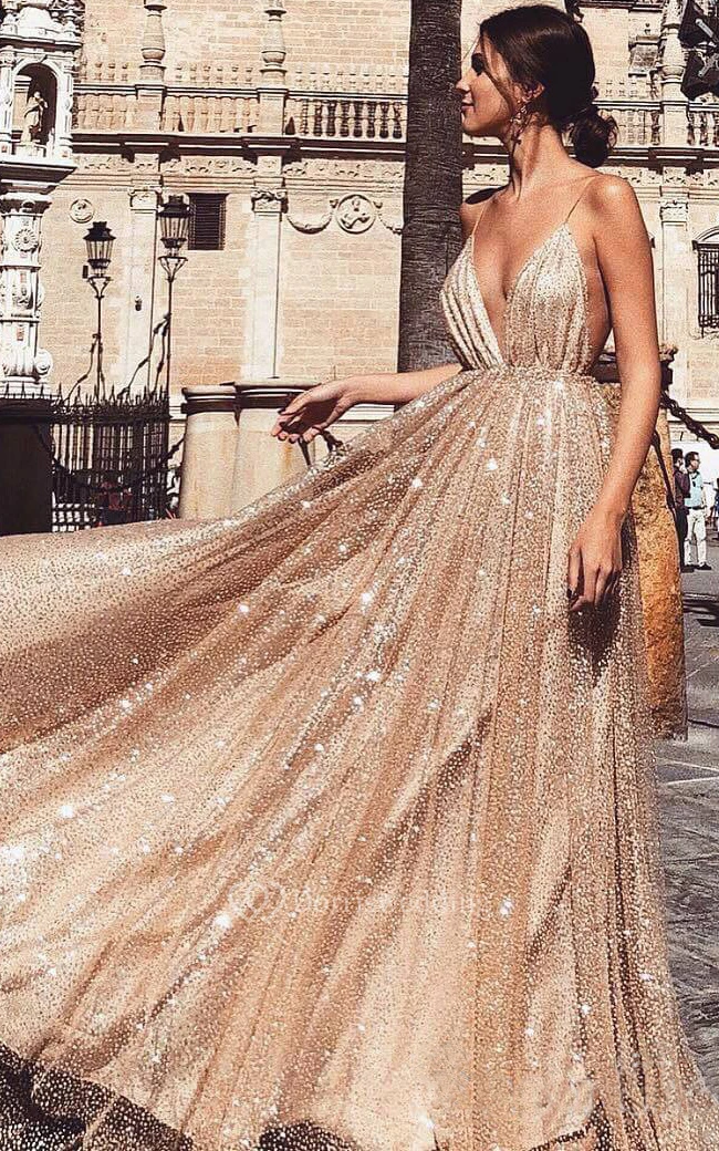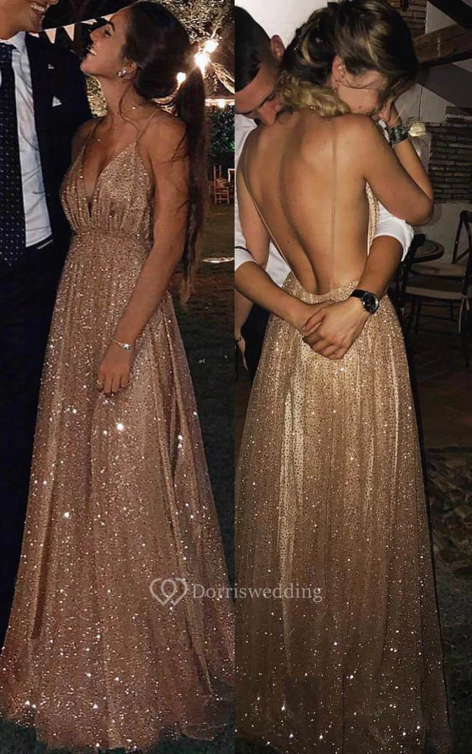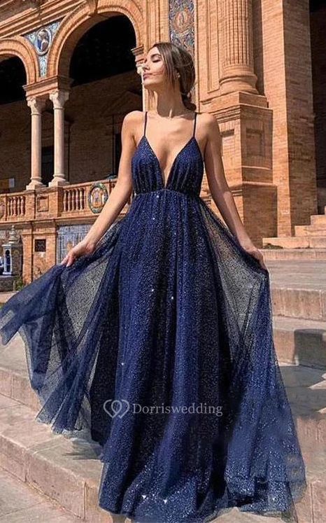 Sexy Plunged Spaghetti Empire A-line Sequin Prom Dress