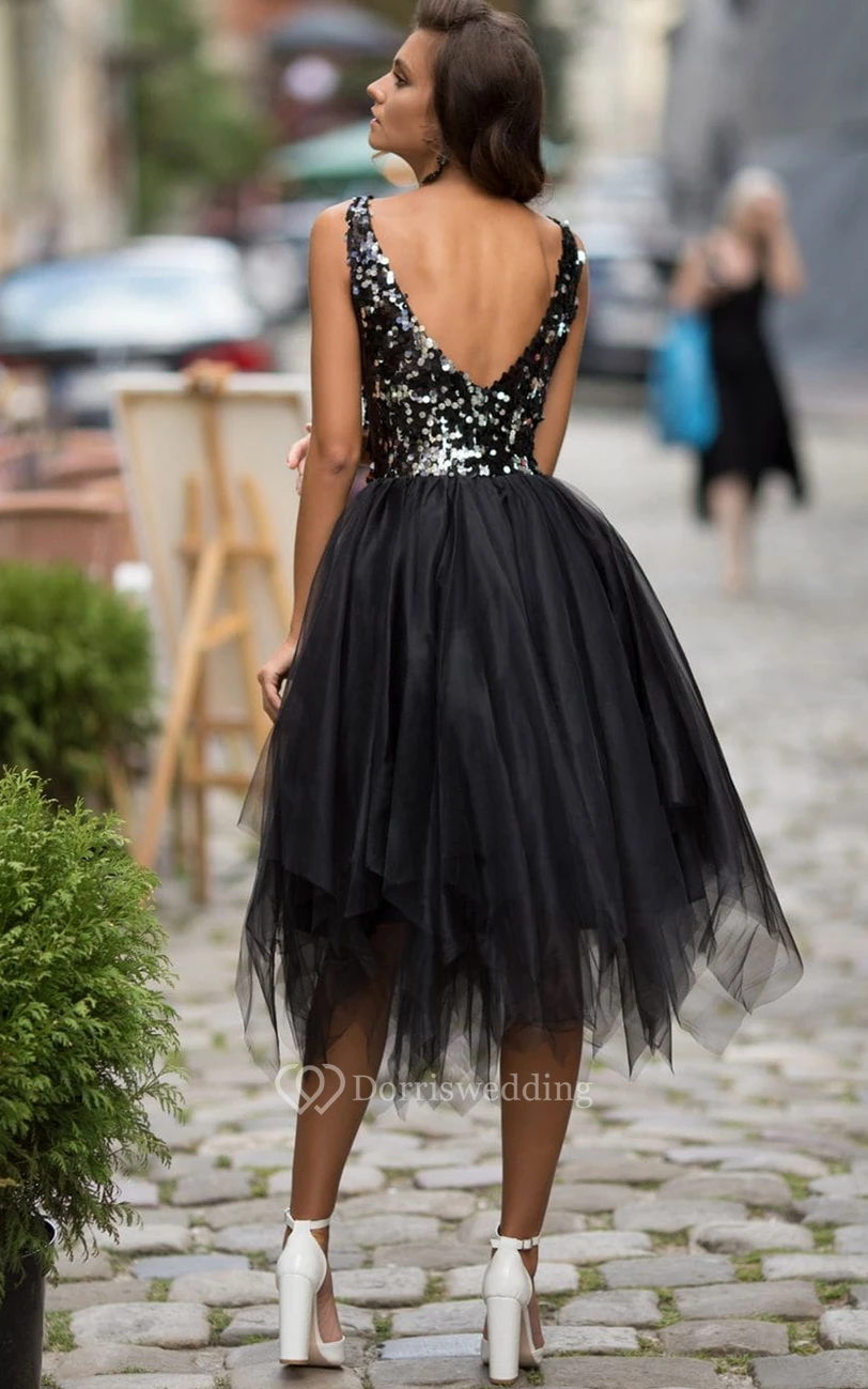 Sexy Plunging Neckline A Line Tulle Knee-length Prom Dress with Ruffles