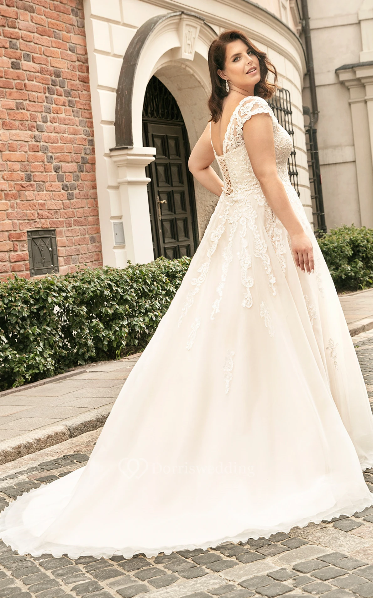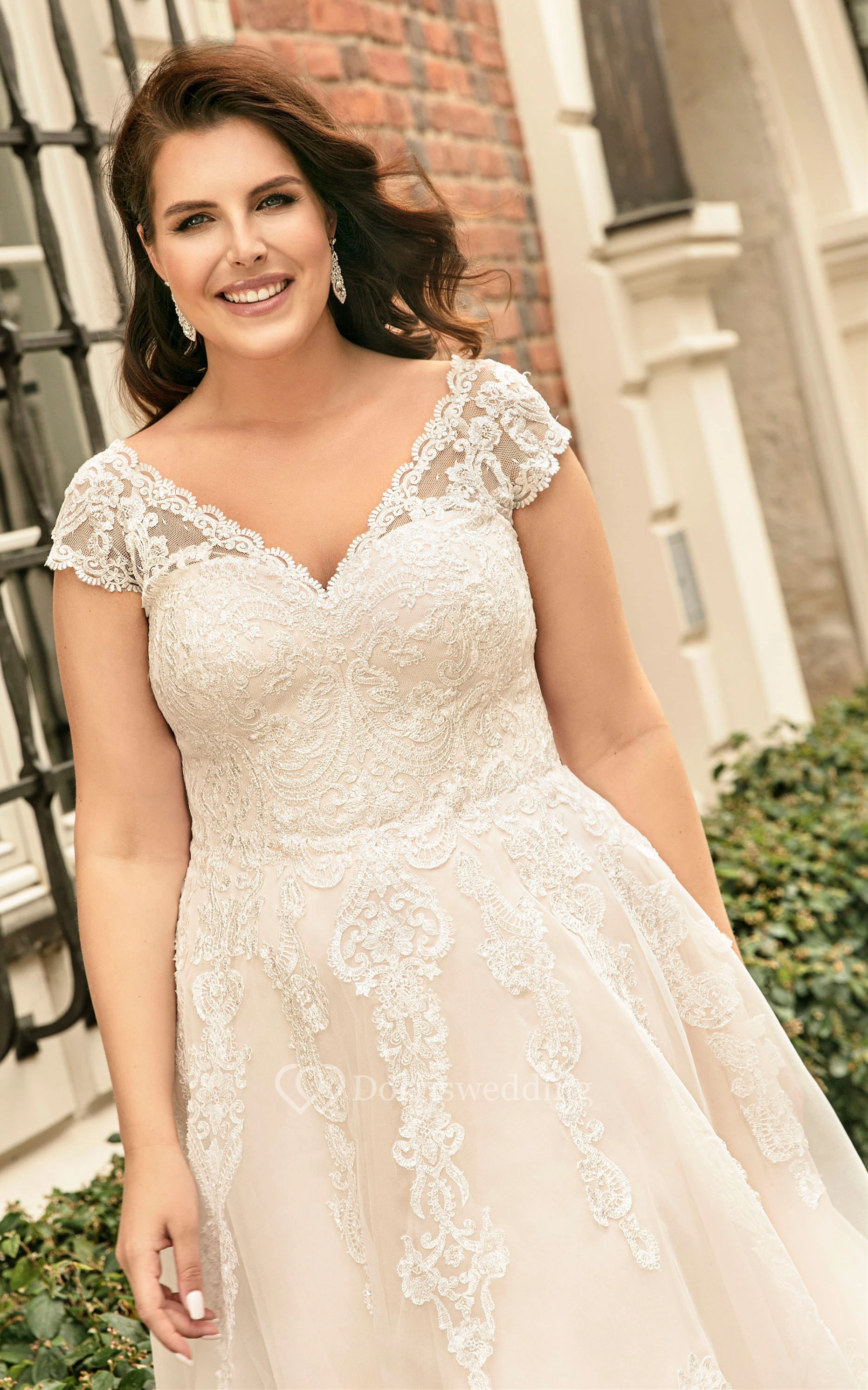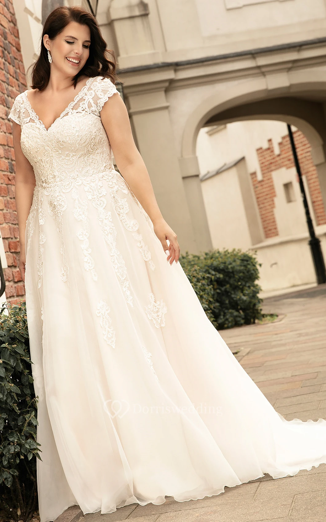 Sexy Plus Size A Line Lace V-neck Wedding Dress with Appliques