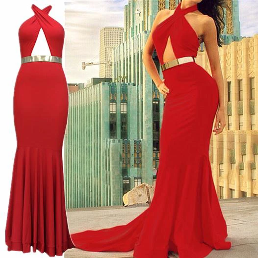 Sexy Red Halter Mermaid Prom Dresses Sweep Train Evening Dresses