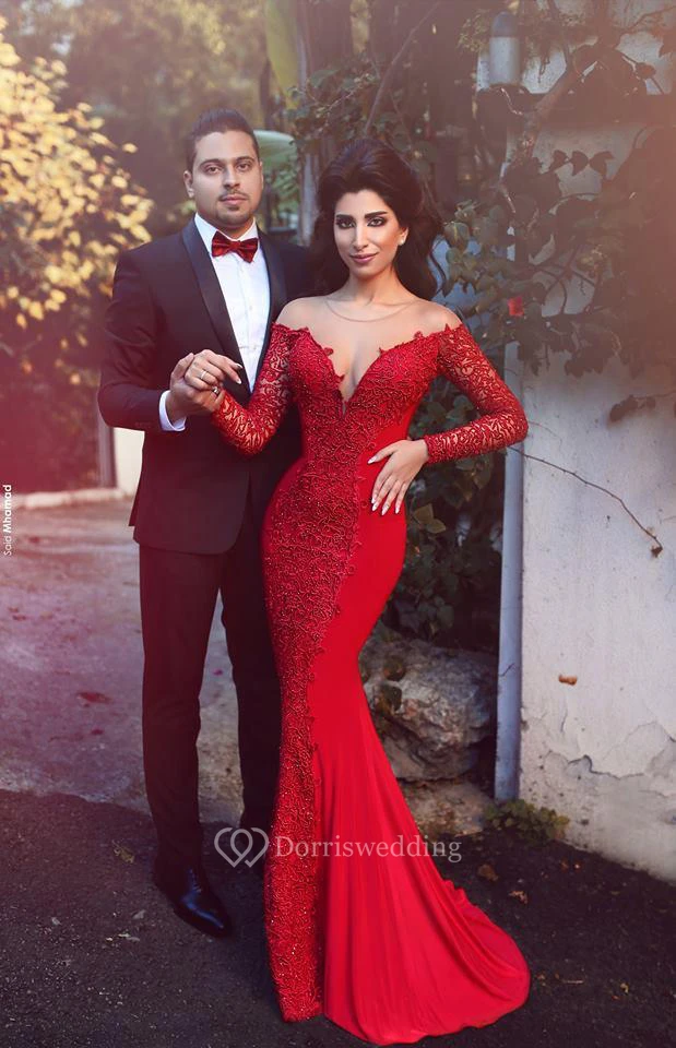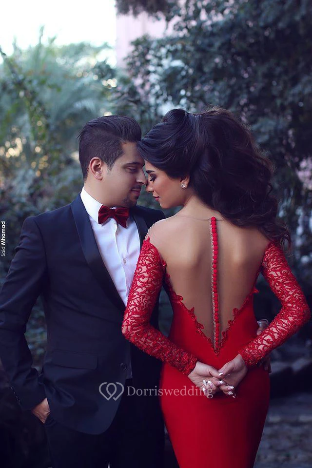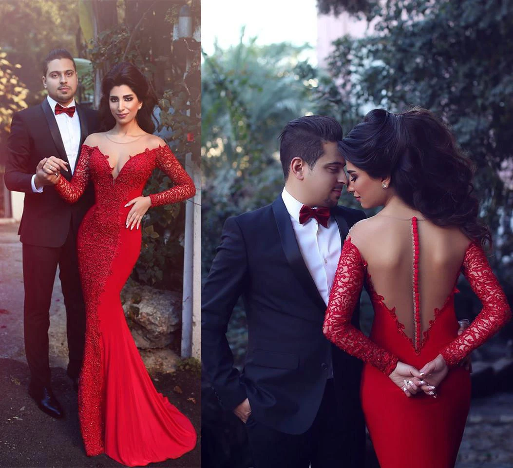 Sexy Red Long Sleeve Lace Evening Dress Mermaid Zipper Button Back