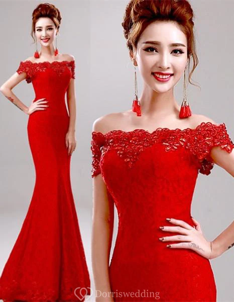 Sexy Red Off the Shoulder Mermaid Prom Dress With Lace Beadings