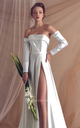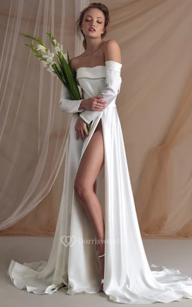 Sexy Satin A Line Floor-length Long Sleeve Wedding Dress with Ruching
