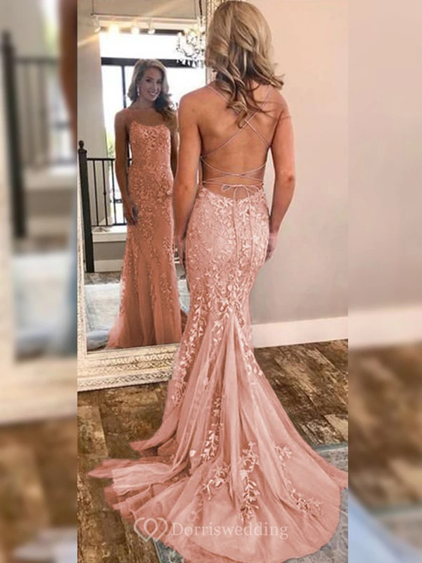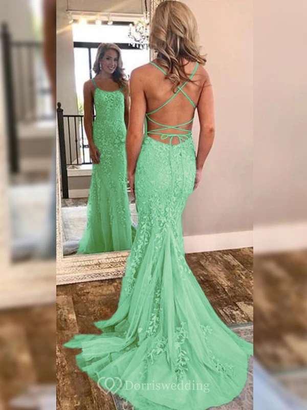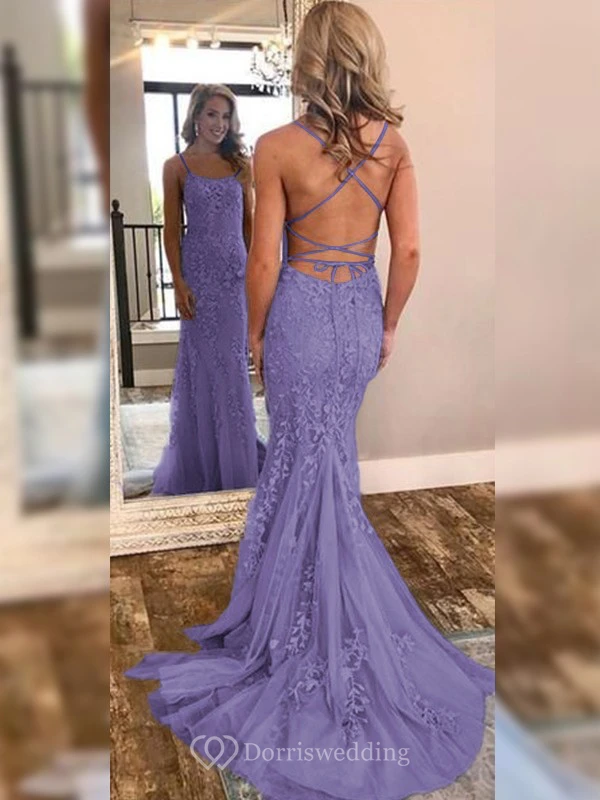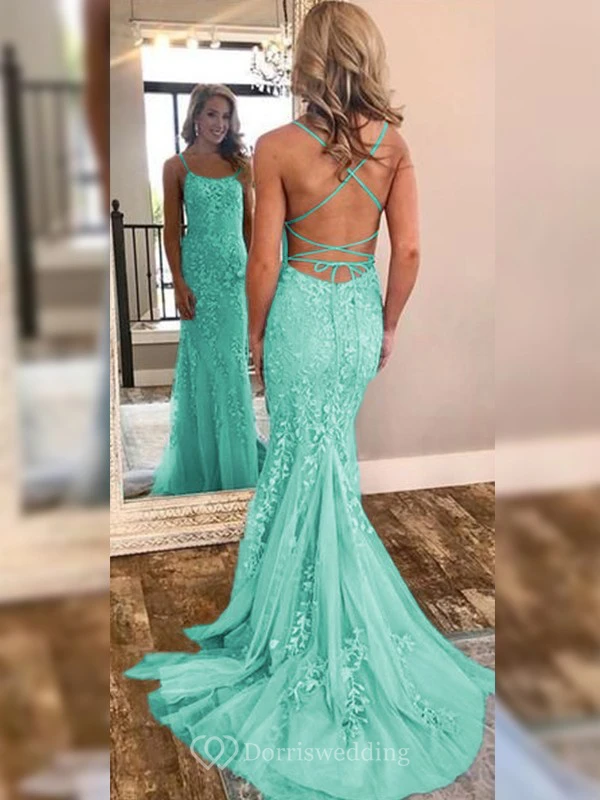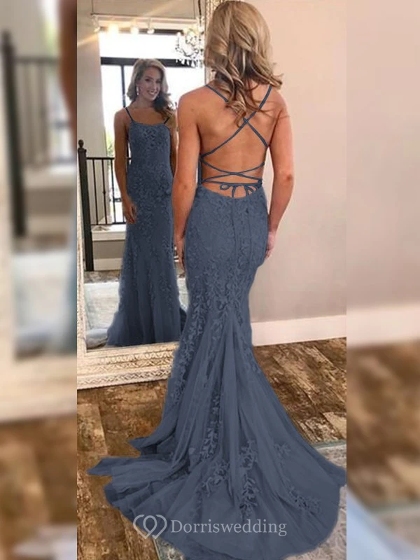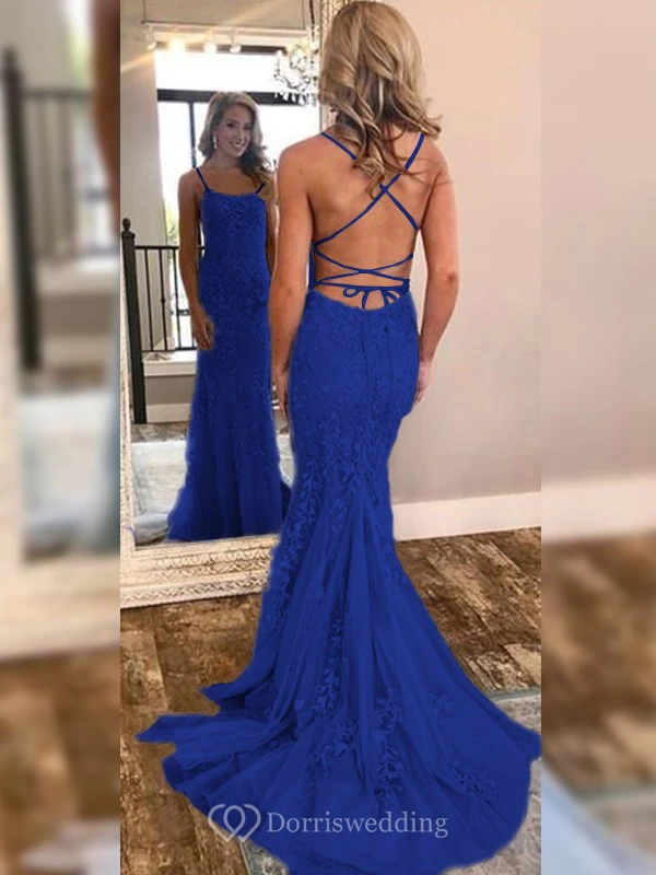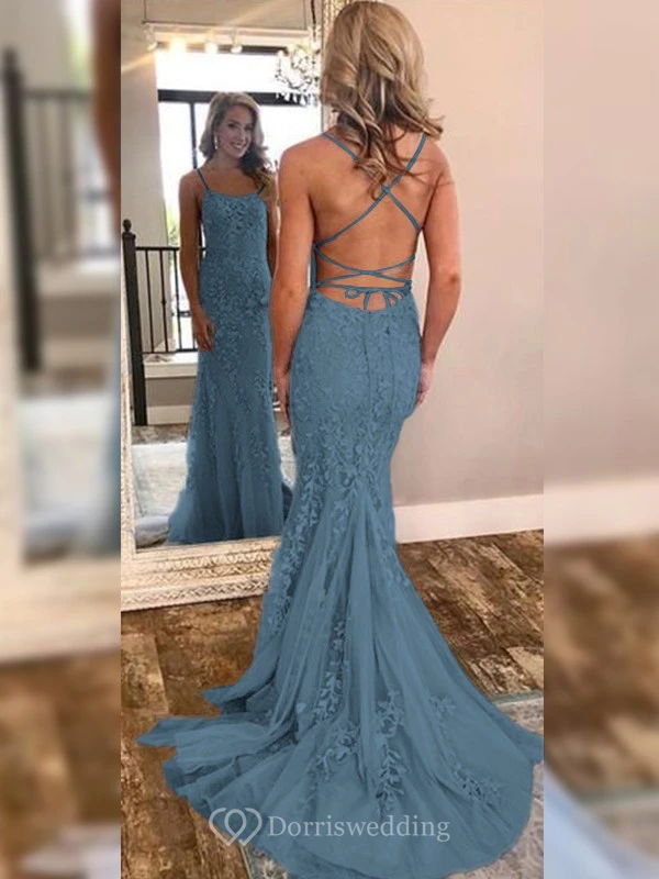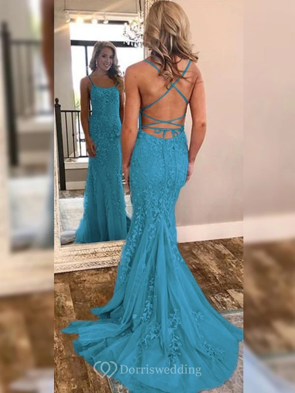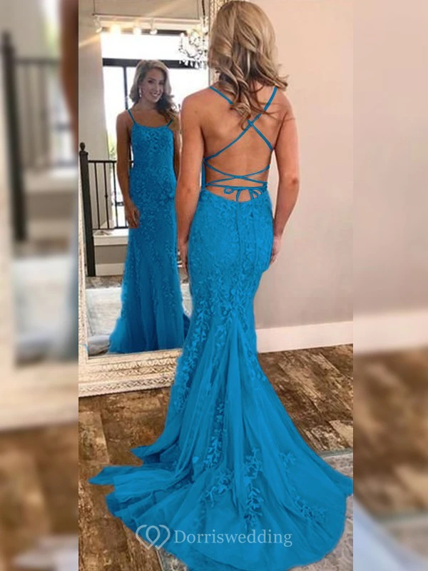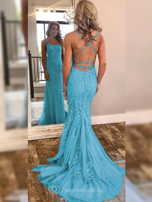 Sexy Sheath Sky Blue Prom Lace Applique Mermaid Spaghetti Backless Dress