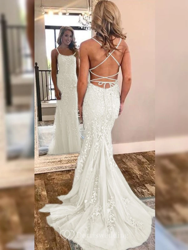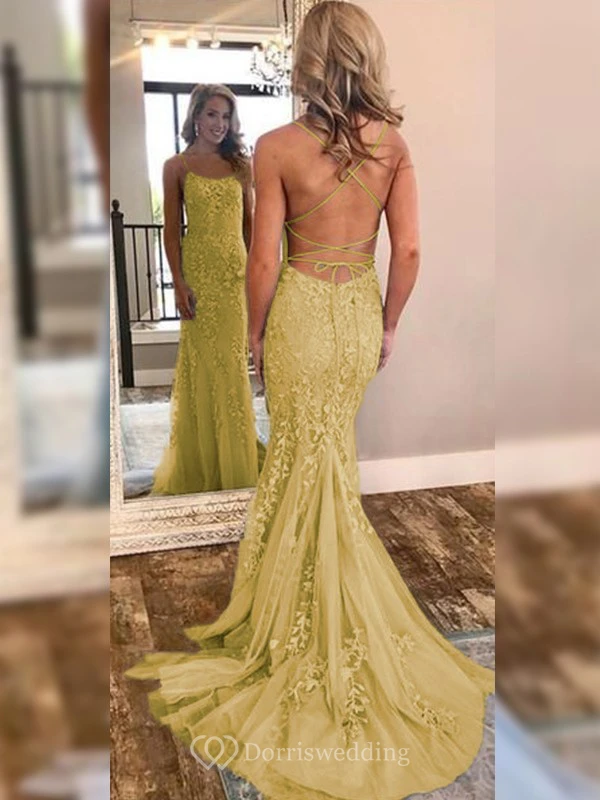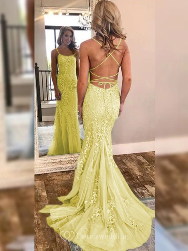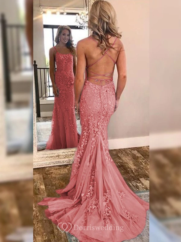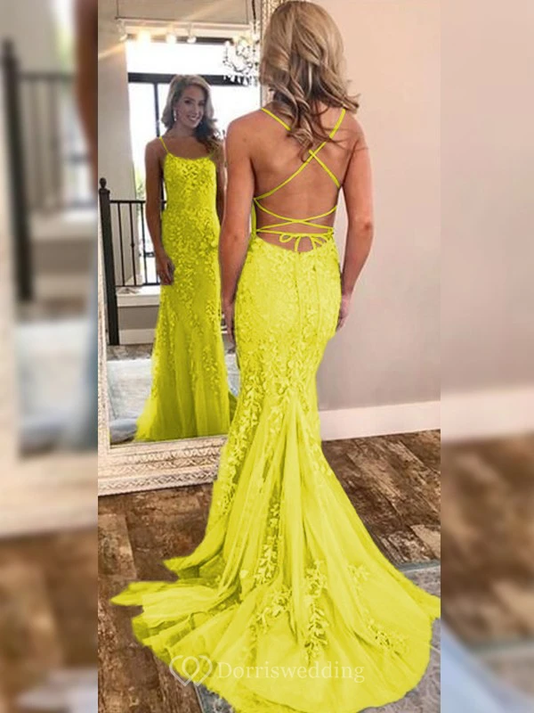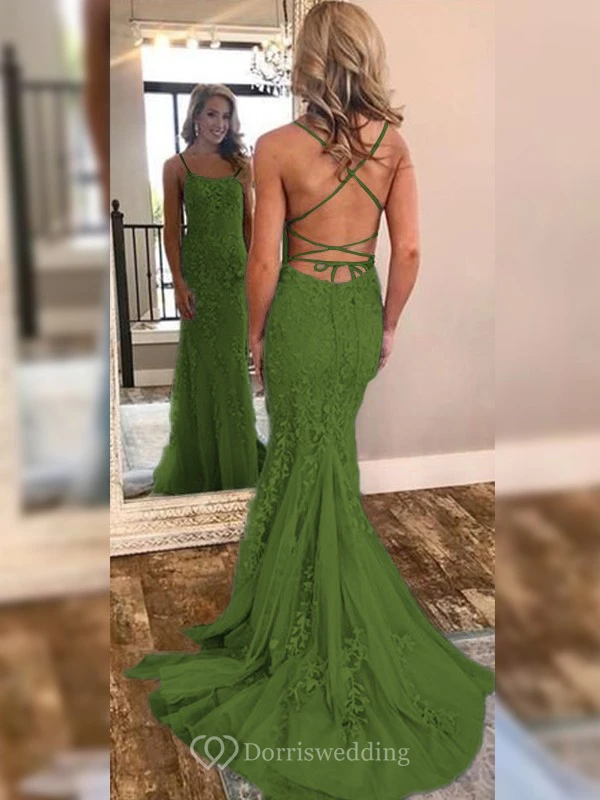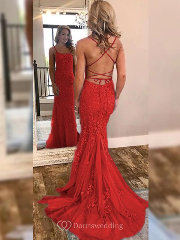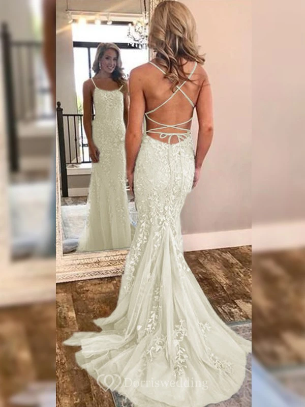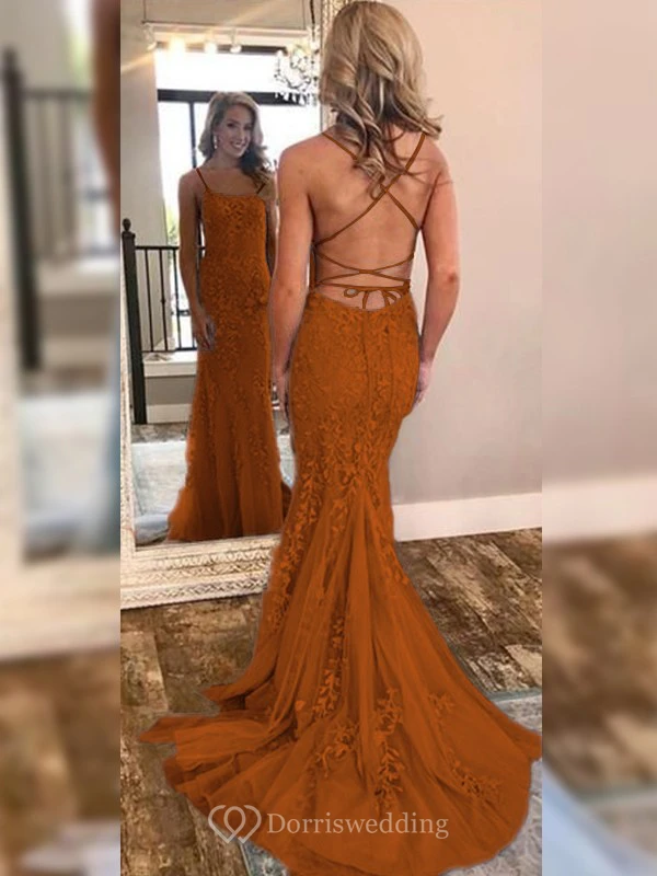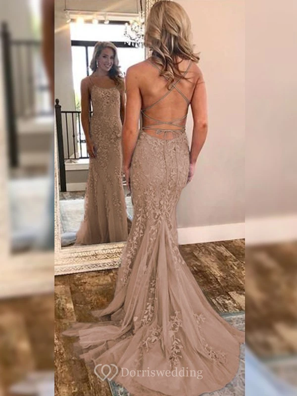 Sexy Sheath Sky Blue Prom Lace Applique Mermaid Spaghetti Backless Dress