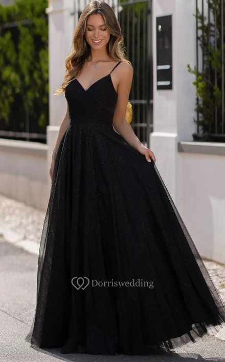 Sexy Sleeveless Floor-length A Line Tulle Deep-V Back Prom Dress with Ruching