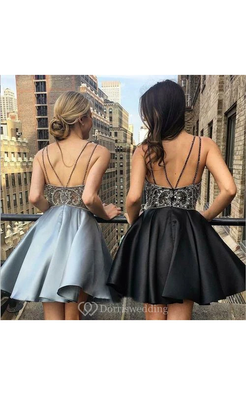 Sexy Spaghetti Notched Empire A-line Short Prom Dress with Beaded Top