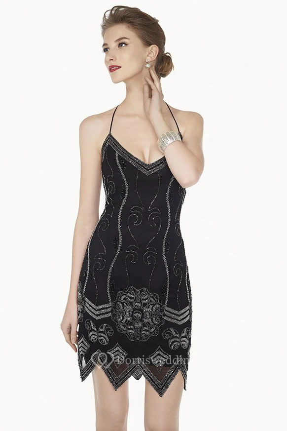 Sexy Spaghetti Straps Tulle Mini Prom Dress With Halter Neckline And Beadings