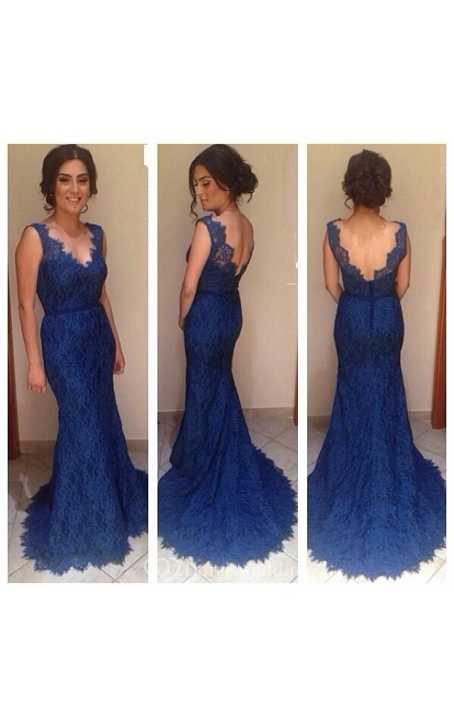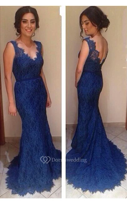 Sexy V-neck Mermaid Lace Prom Dress Sweep Train Zipper