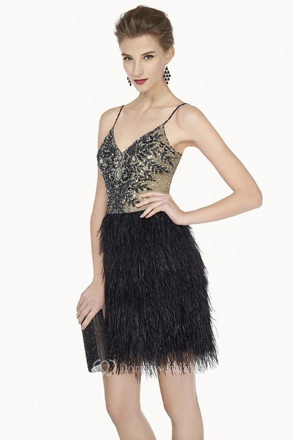Sexy V Neck Mini Feather Prom Dress With Beaded Spaghetti Straps And Top