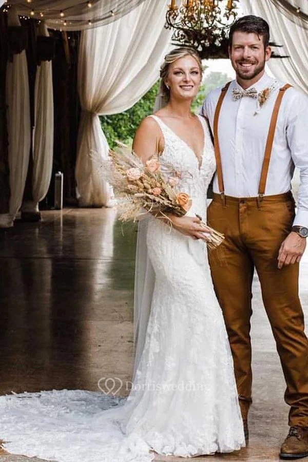 Sexy V-neck Plunged Lace Sheath Sleeveless Wedding Dress