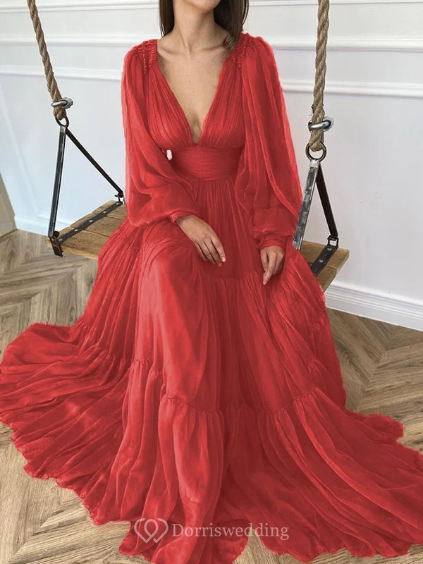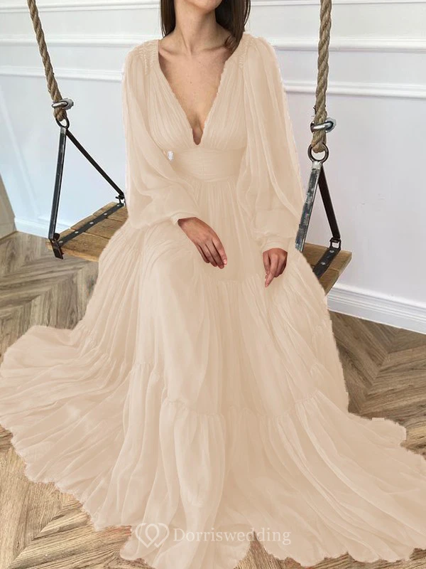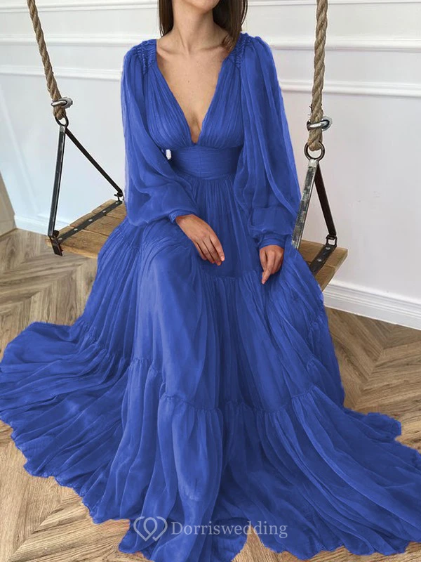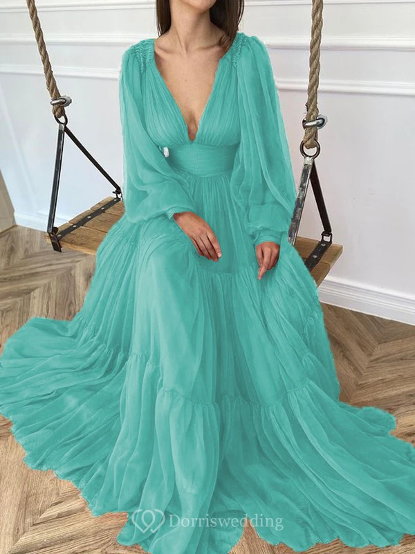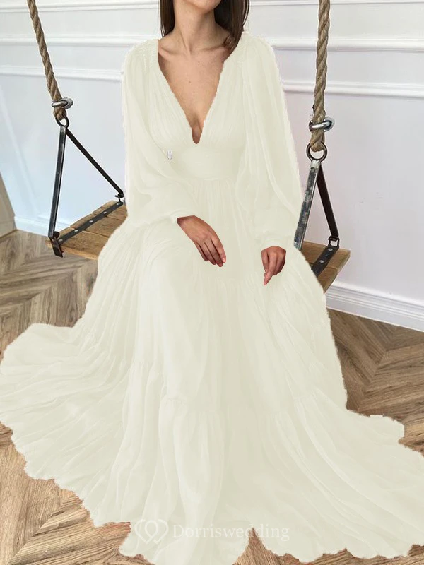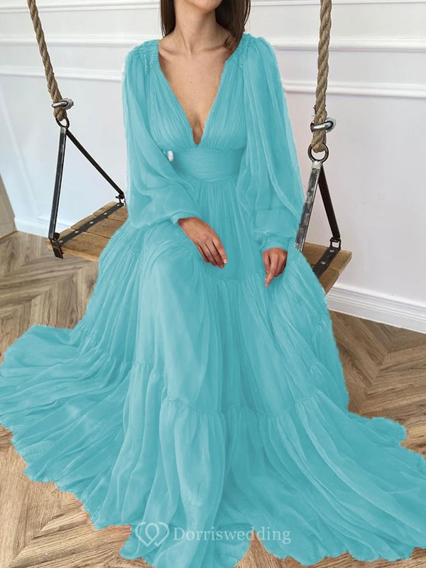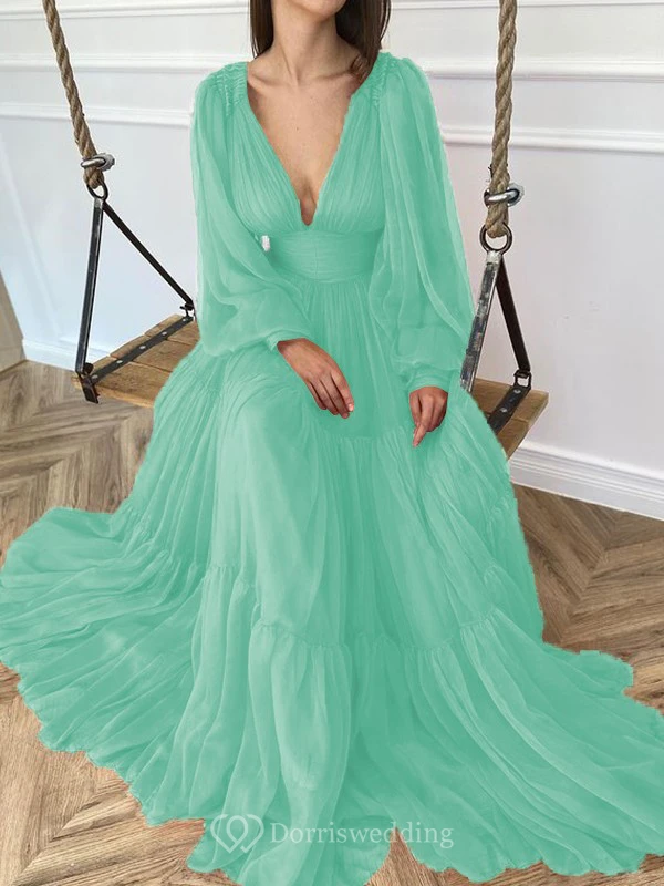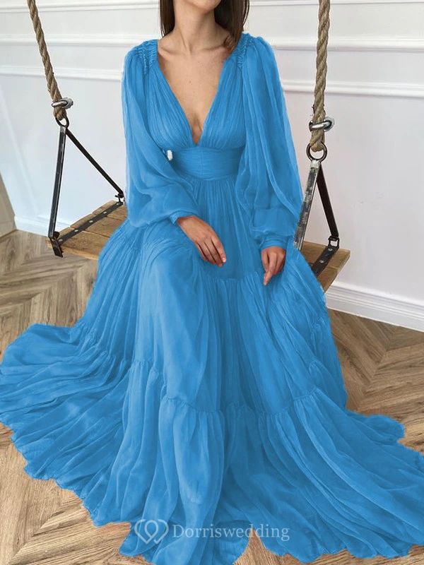 Sexy V-neck Puff Long Sleeve Chiffon Layered Empire Dress