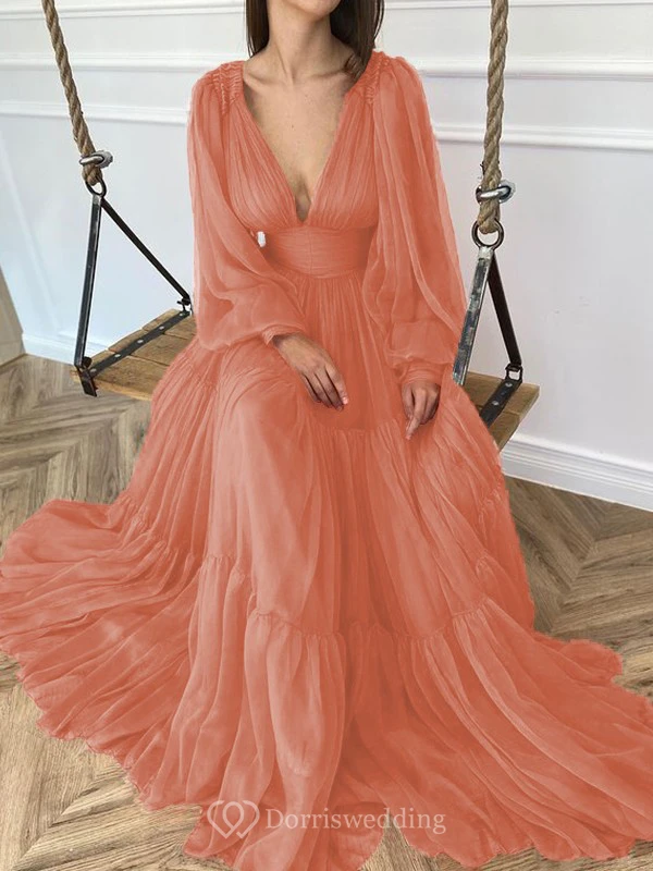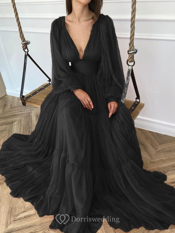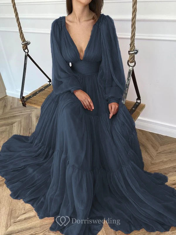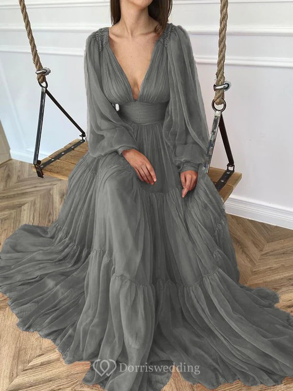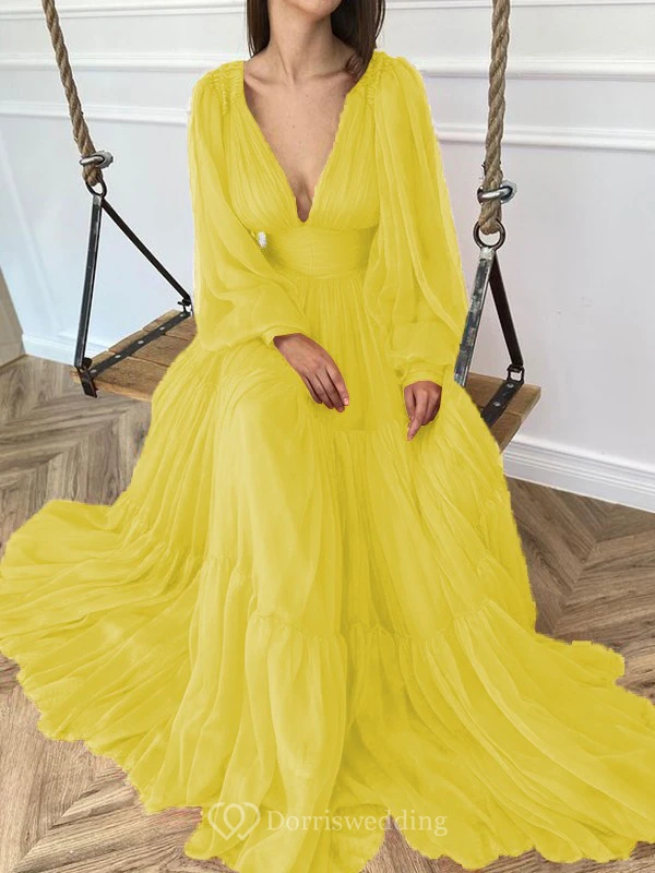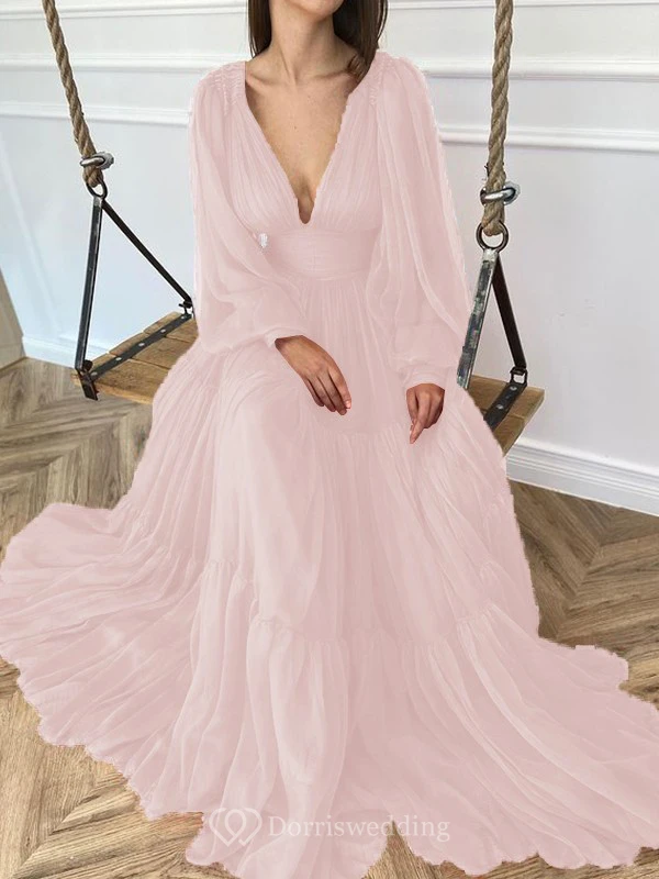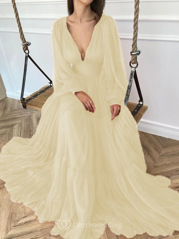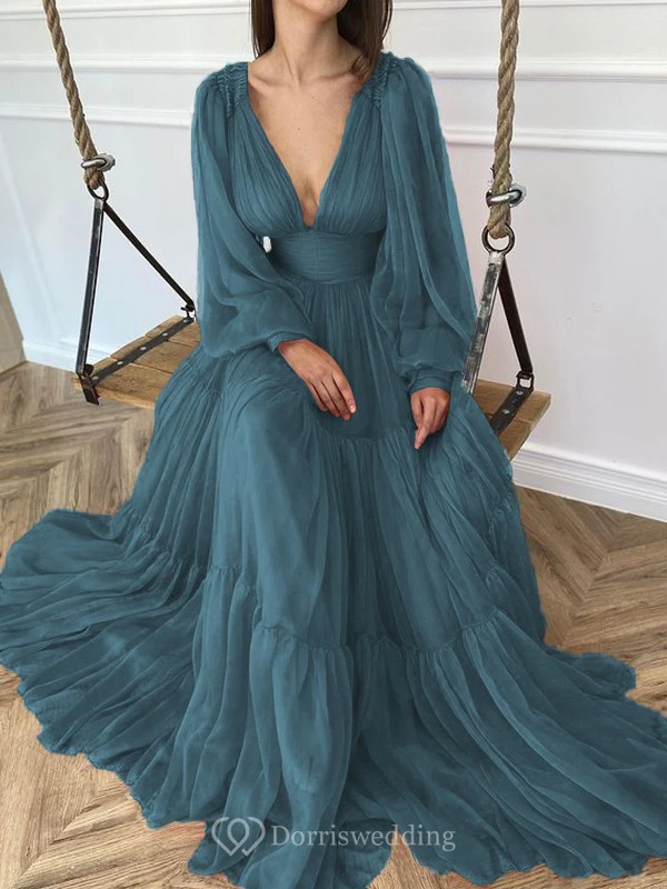 Sexy V-neck Puff Long Sleeve Chiffon Layered Empire Dress