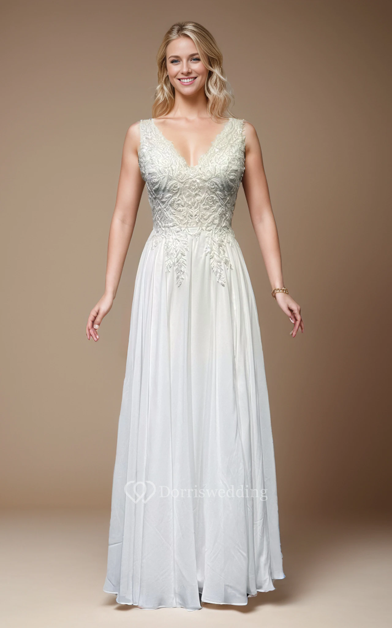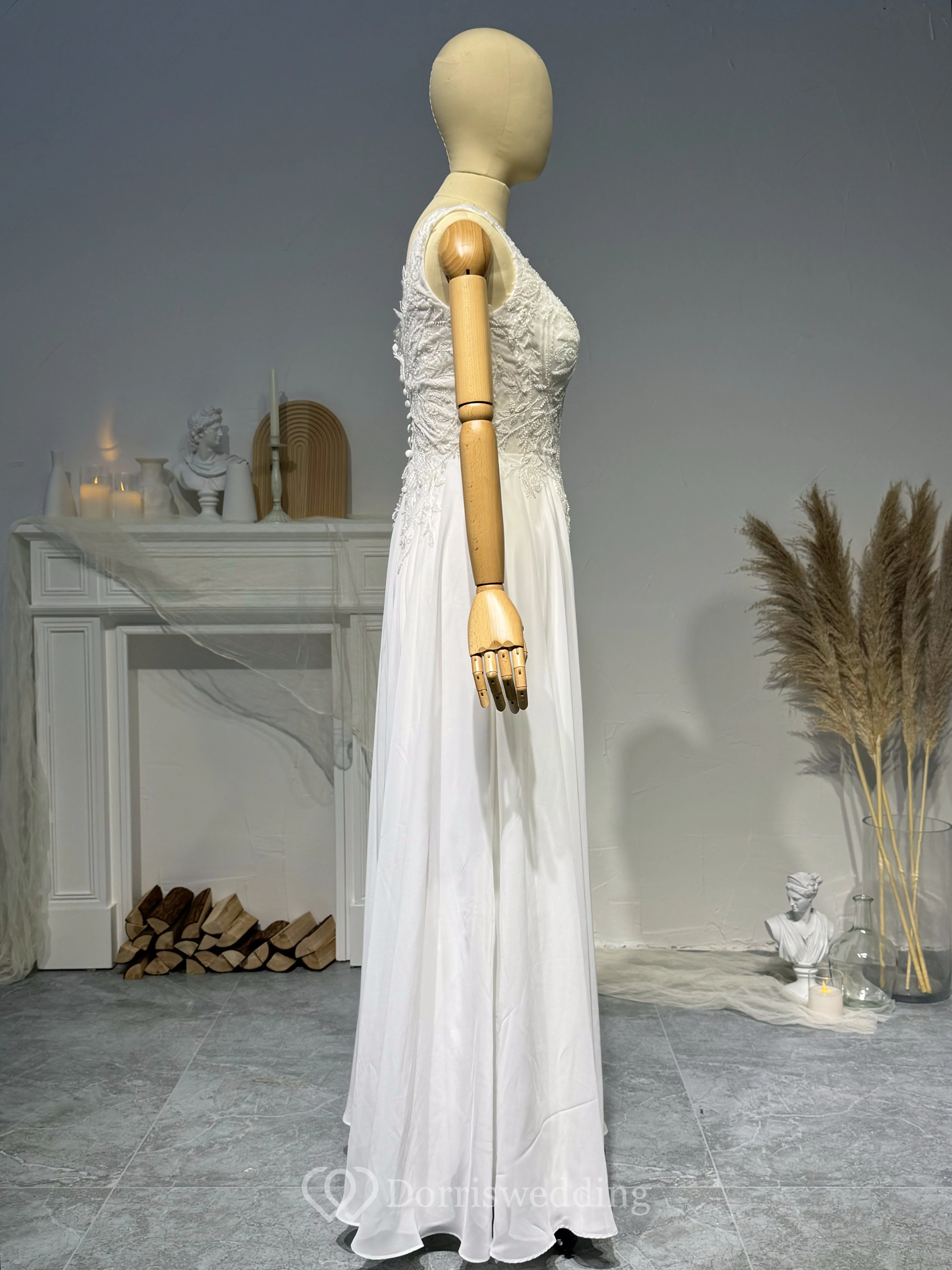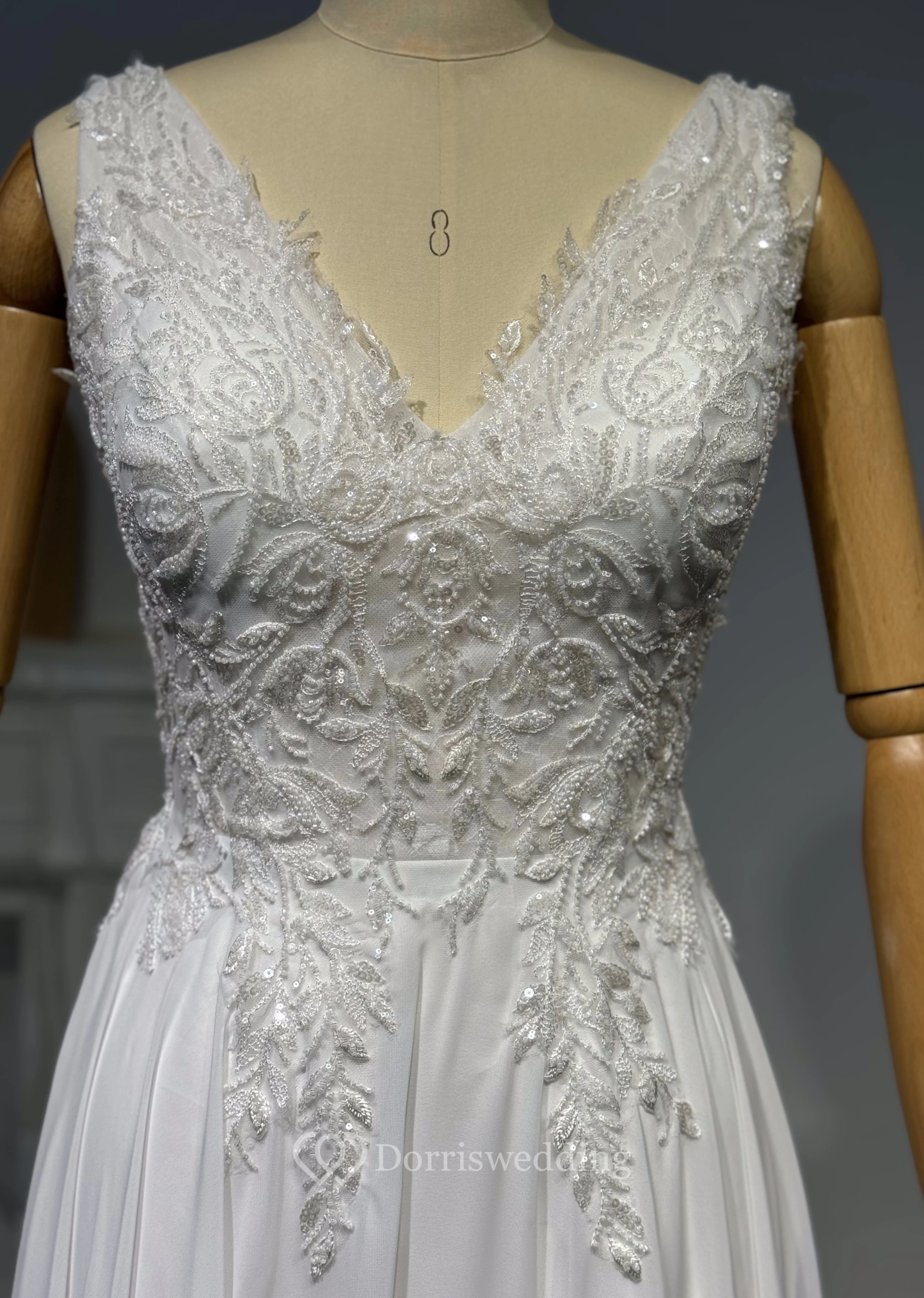 Sexy V-neck Sleeveless Front Split Chiffon Empire Lace Wedding Dress