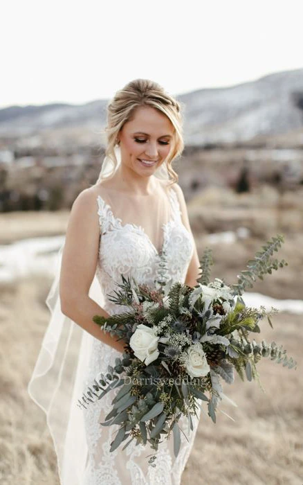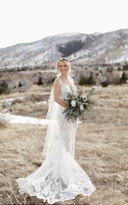 Sexy V-neckline Sleeveless Court Train Lace Boho Wedding Dress with Illusion Back and Appliques
