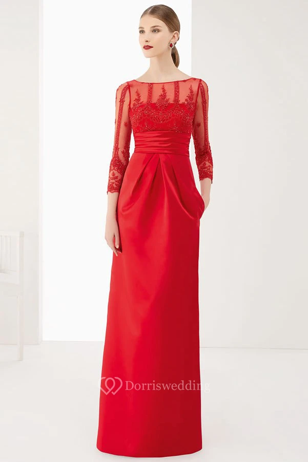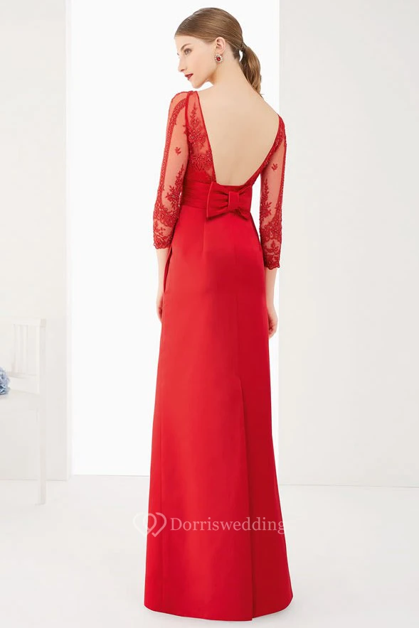 Sheath 3-4-Sleeve Floor-Length Appliqued Bateau-Neck Satin Prom Dress With Bow