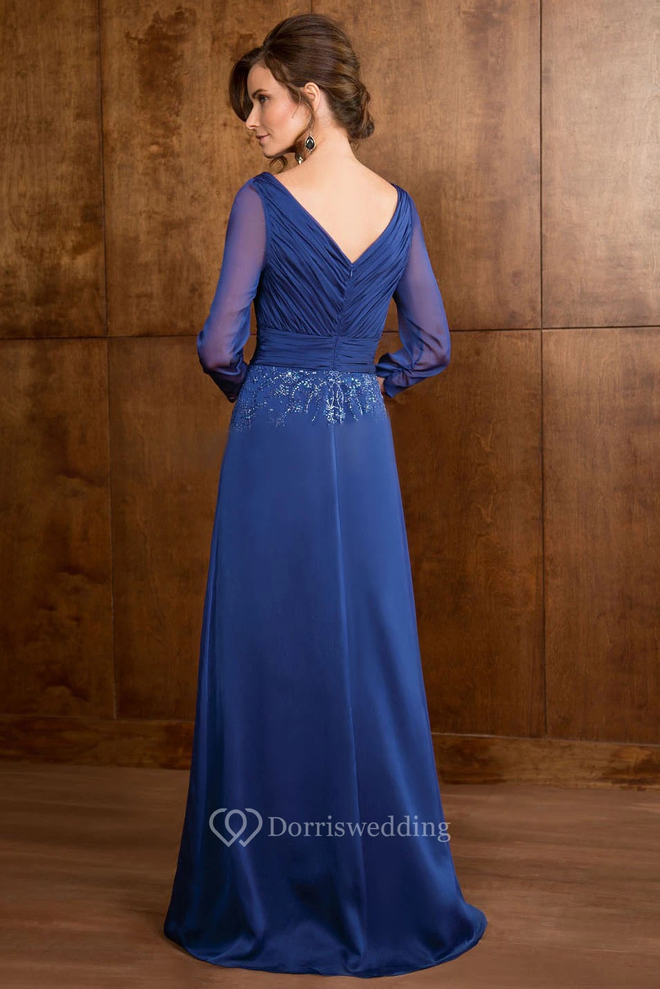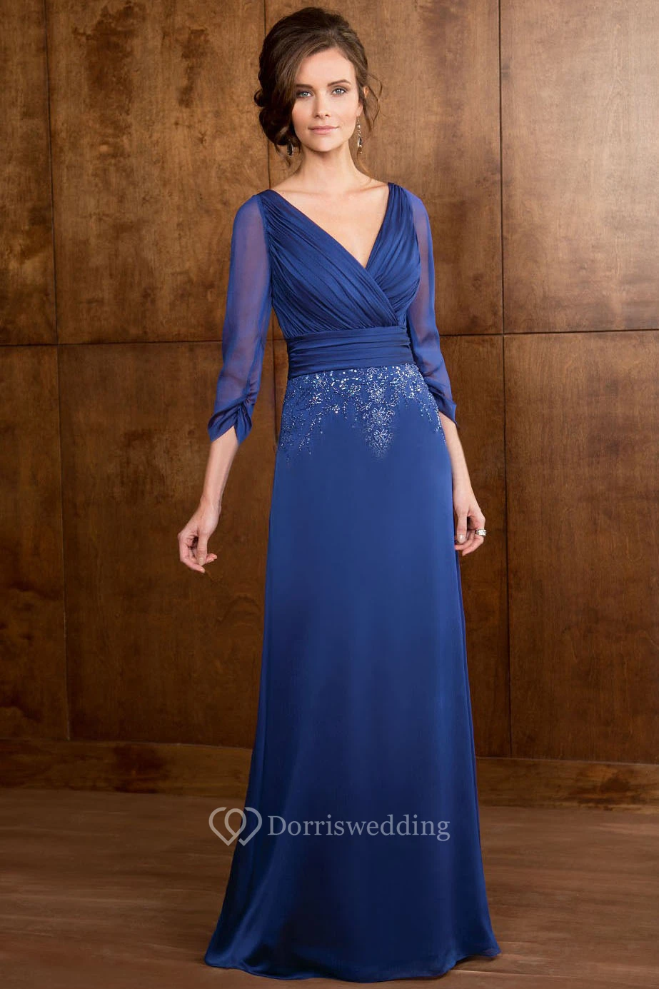 Sheath 3-4-Sleeve Floor-Length V-Neck Ruched Jersey Mother Of The Bride Dress With Beading