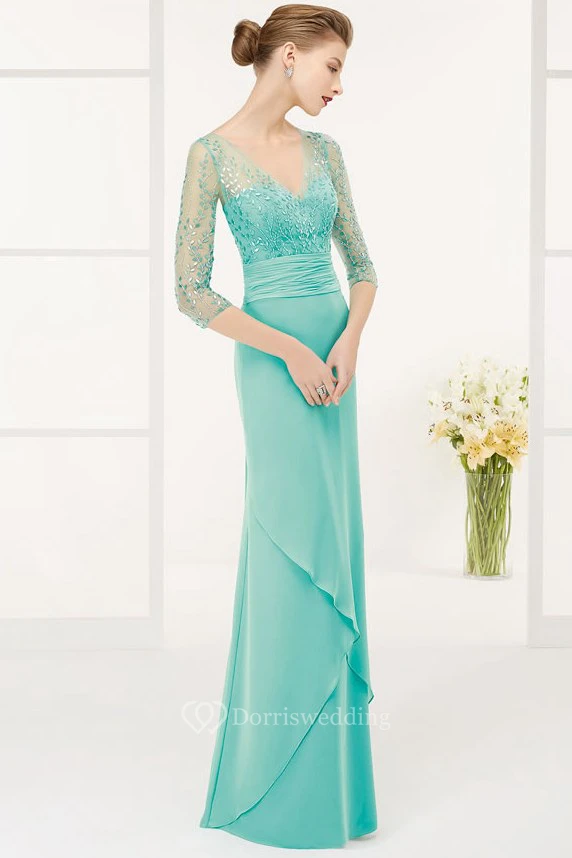 Sheath 3-4-Sleeve Floor-Length V-Neck Sequined Chiffon Prom Dress