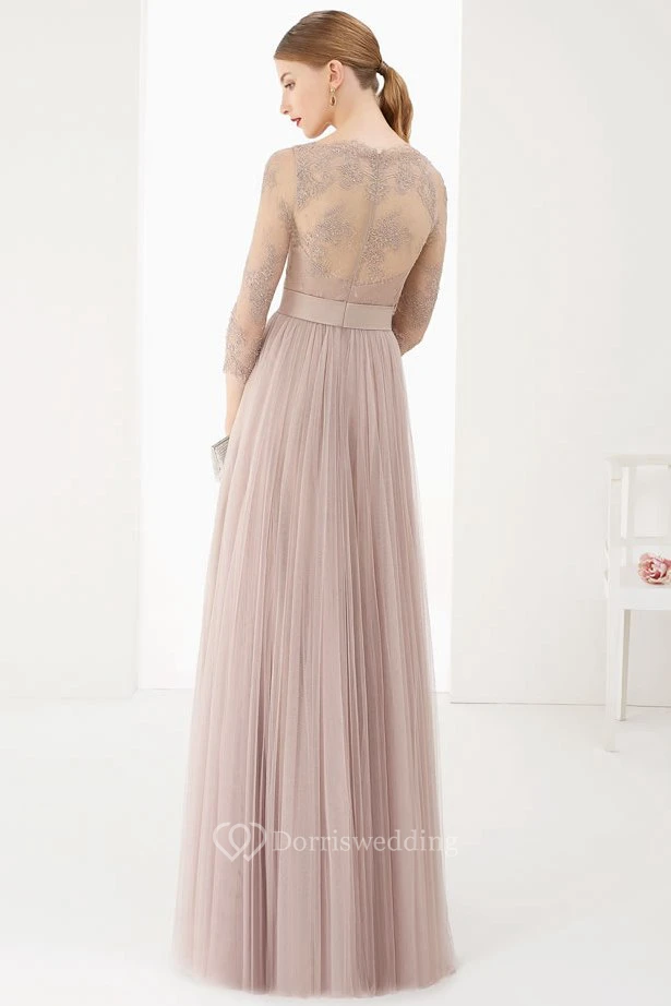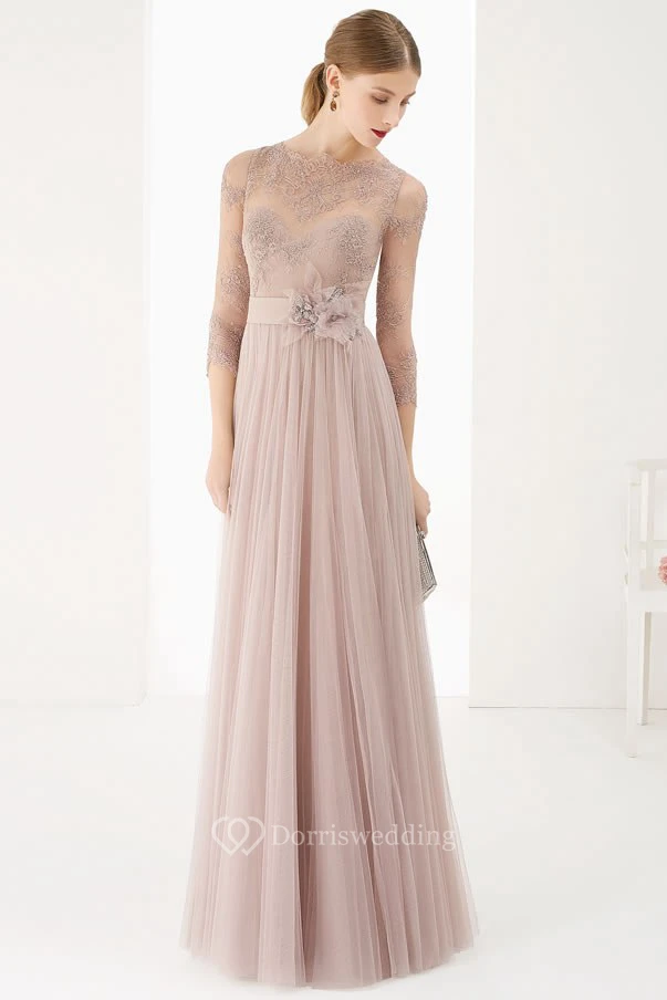 Sheath 3-4-Sleeve Jewel-Neck Floor-Length Lace Tulle Prom Dress With Flower And Pleats