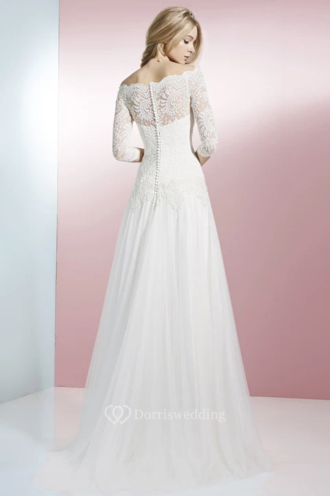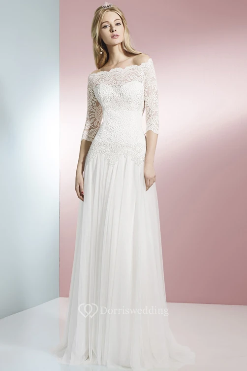 Sheath 3-4 Sleeve Off-The-Shoulder Lace Tulle Modest Wedding Dress With Brush Train