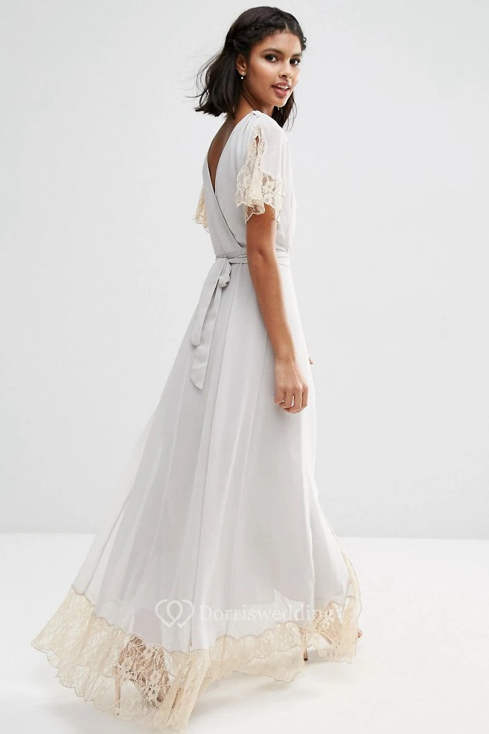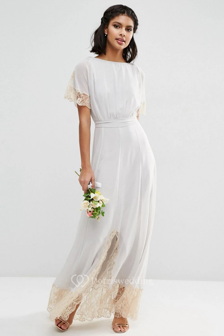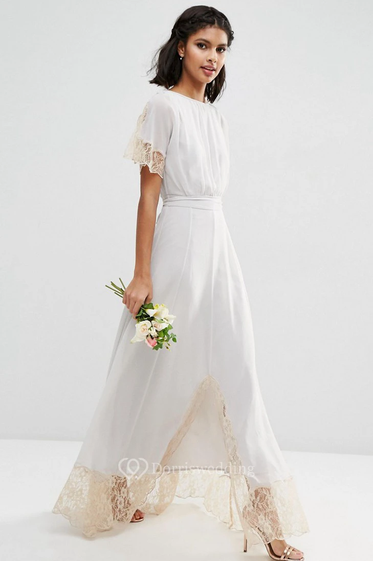 Sheath Ankle-Length Short Sleeve Scoop Neck Lace Chiffon Modest Bridesmaid Dress