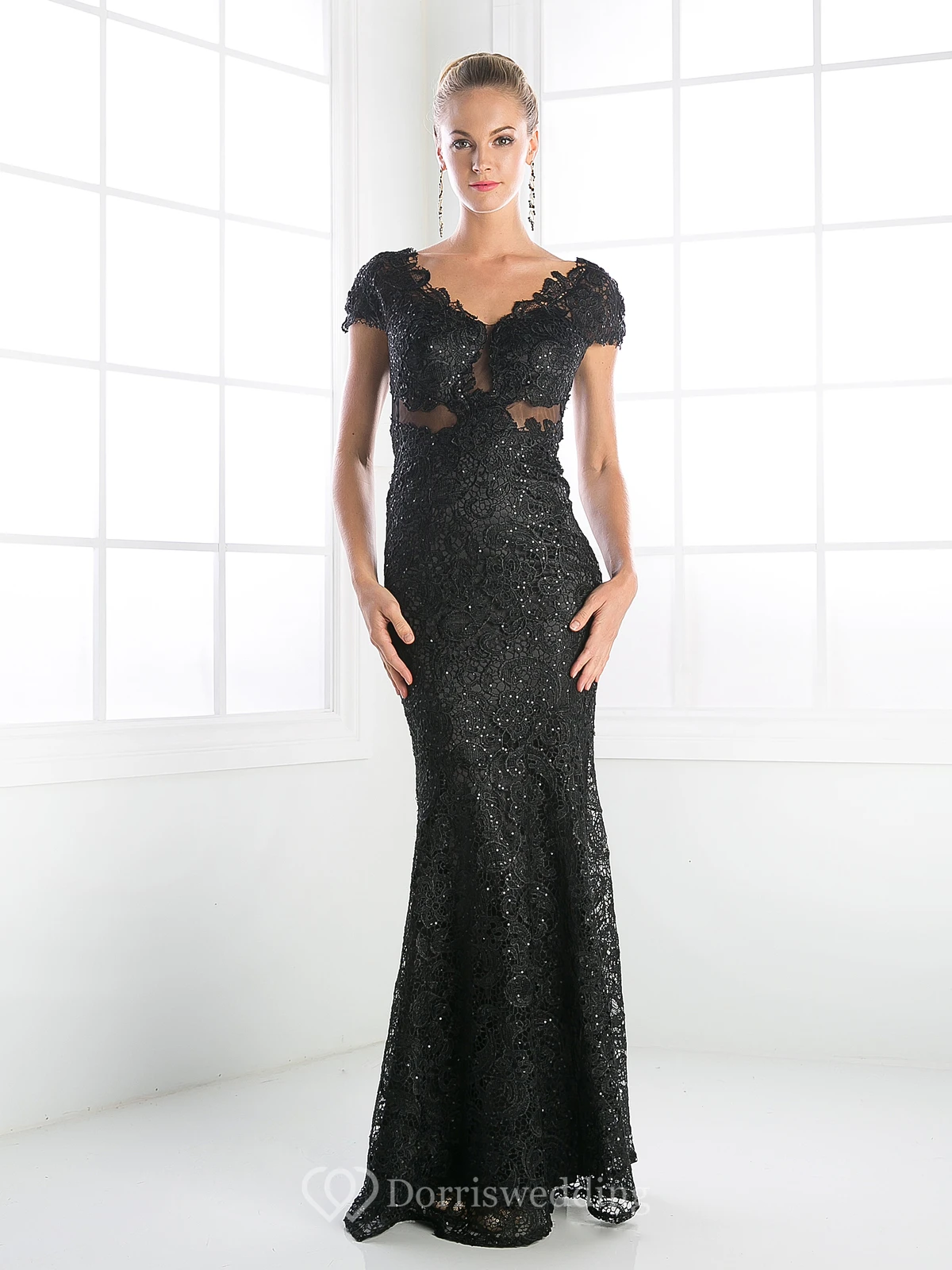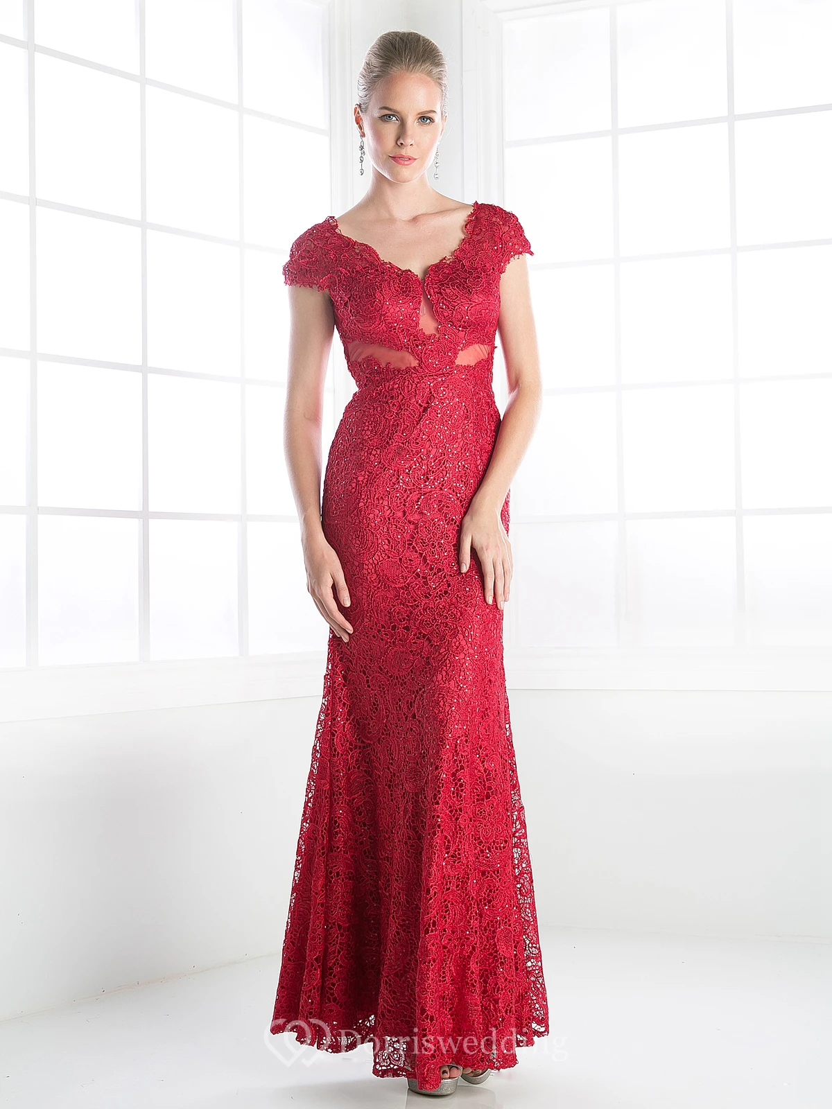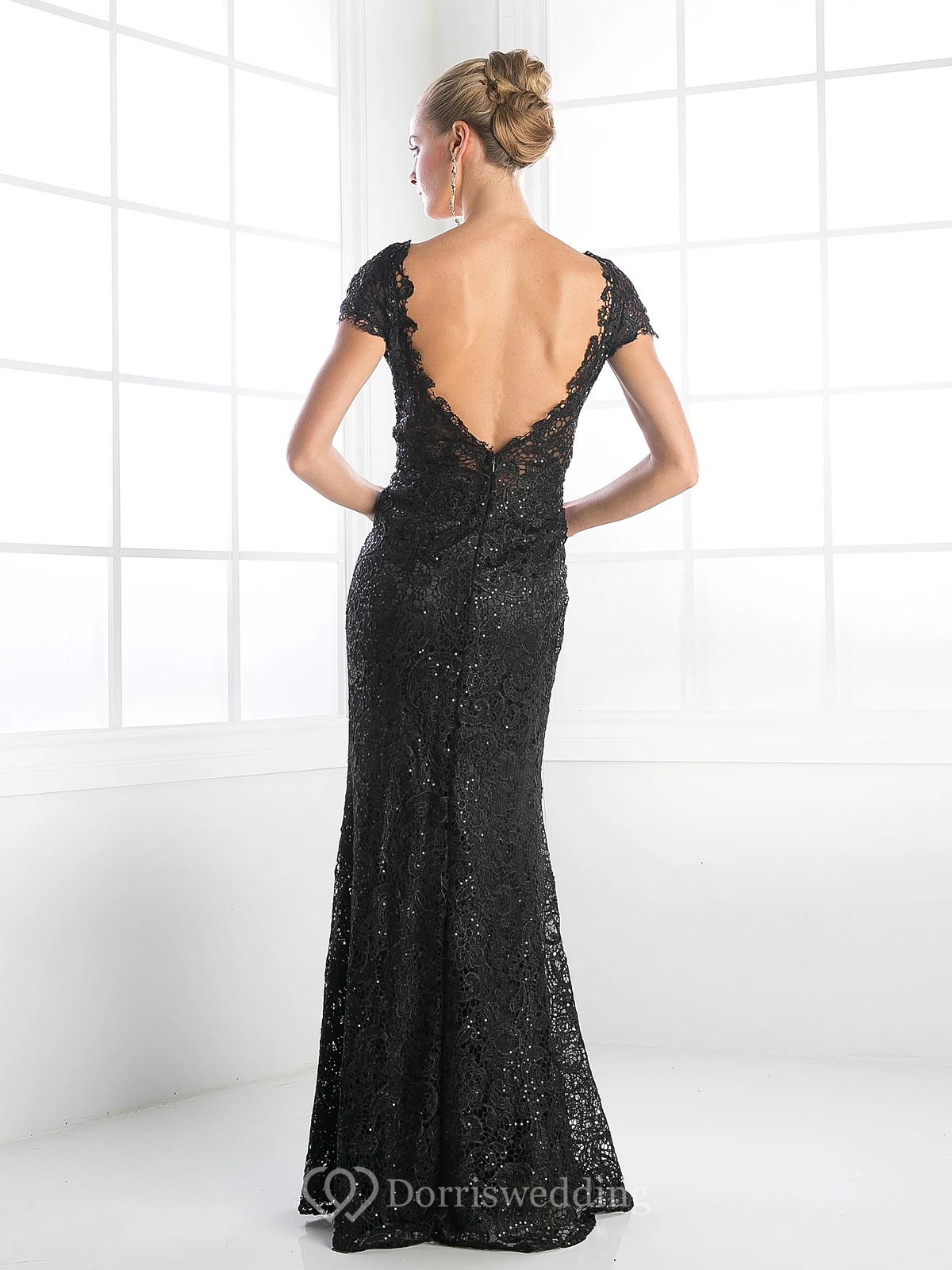 Sheath Ankle-Length V-Neck Short Sleeve Lace Deep-V Back Dress With Beading