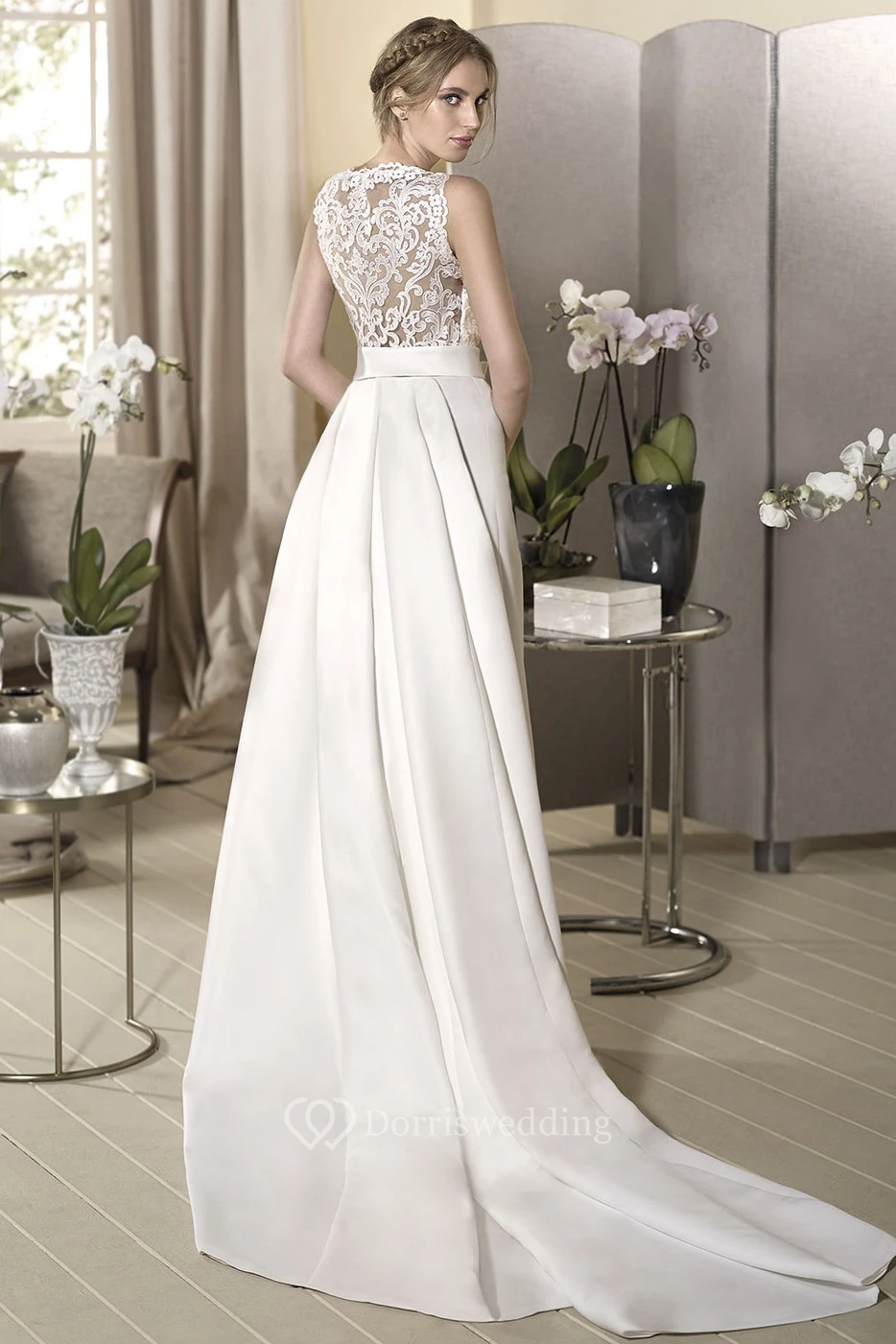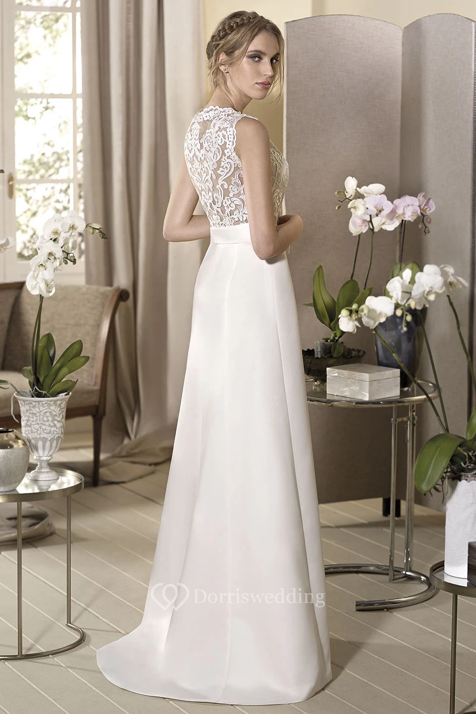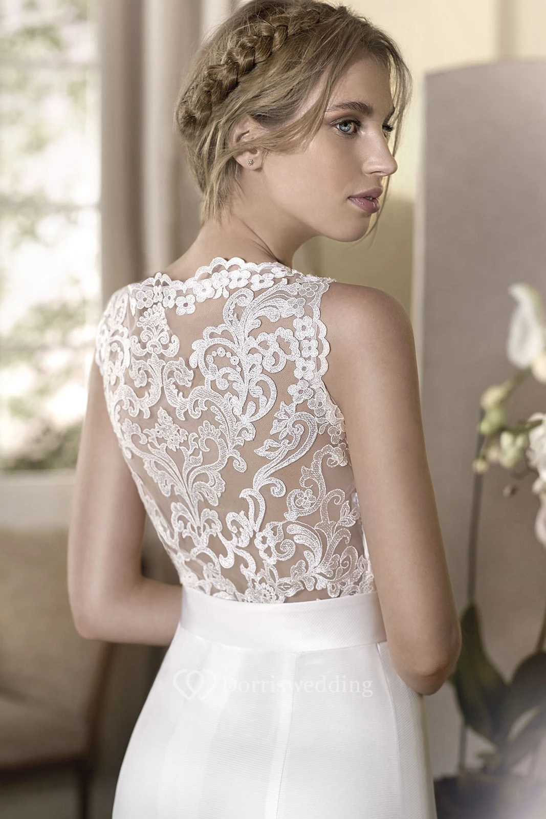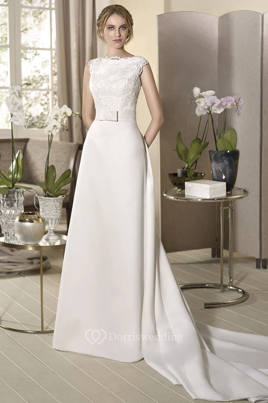 Sheath Appliqued Cap-Sleeve Floor-Length Bateau-Neck Satin Wedding Dress