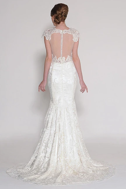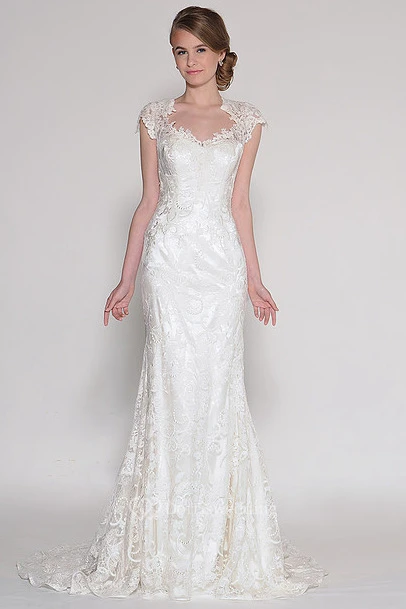 Sheath Appliqued Cap-Sleeve V-Neck Floor-Length Lace Wedding Dress