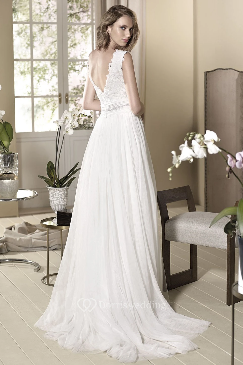 Sheath Appliqued Cap-Sleeve V-Neck Maxi Wedding Dress With Pleats