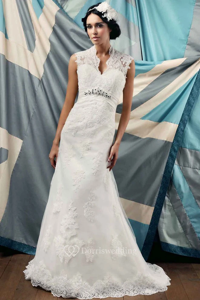 Sheath Appliqued Floor-Length Cap-Sleeve Notched Lace Wedding Dress With Waist Jewellery